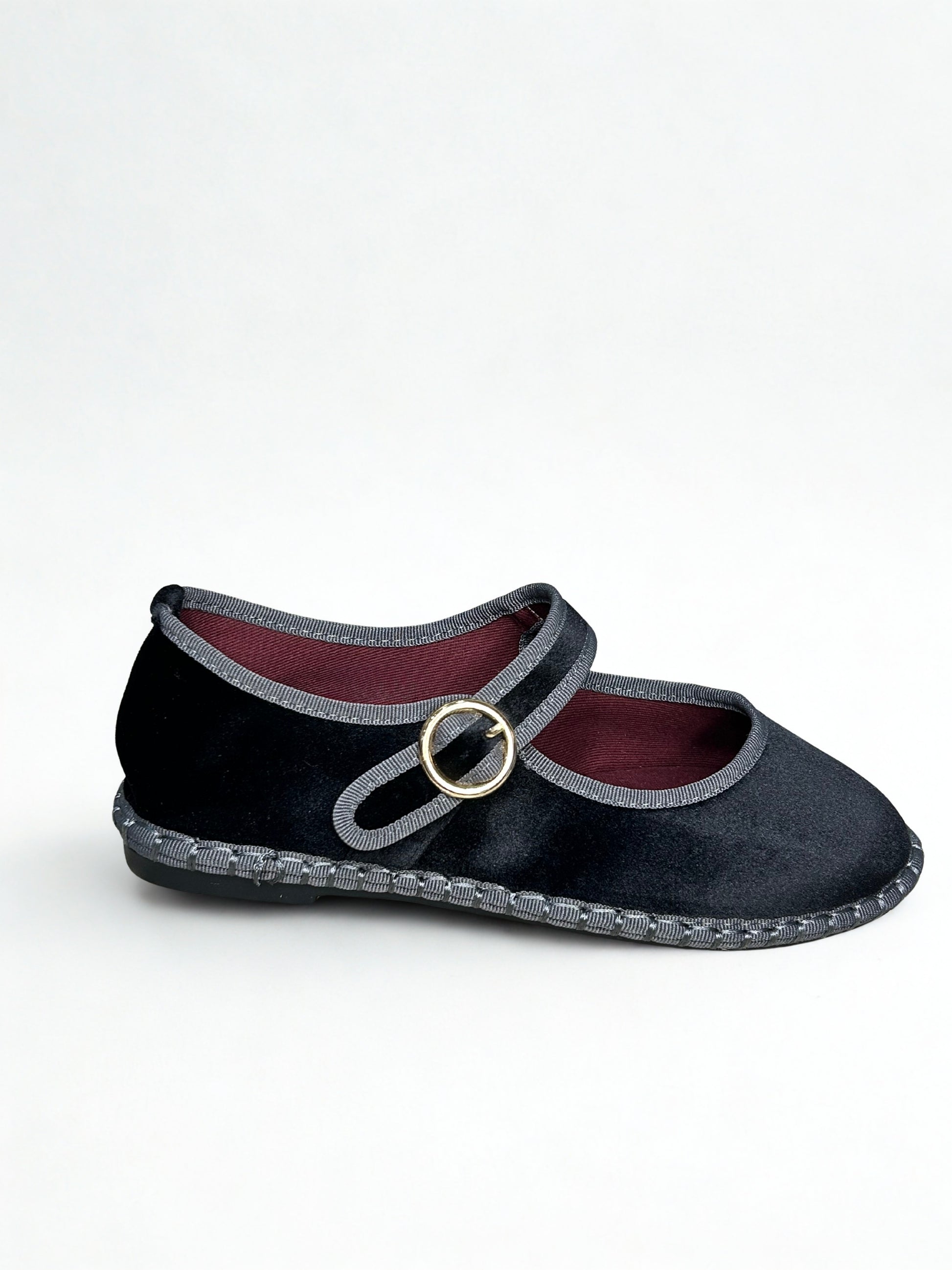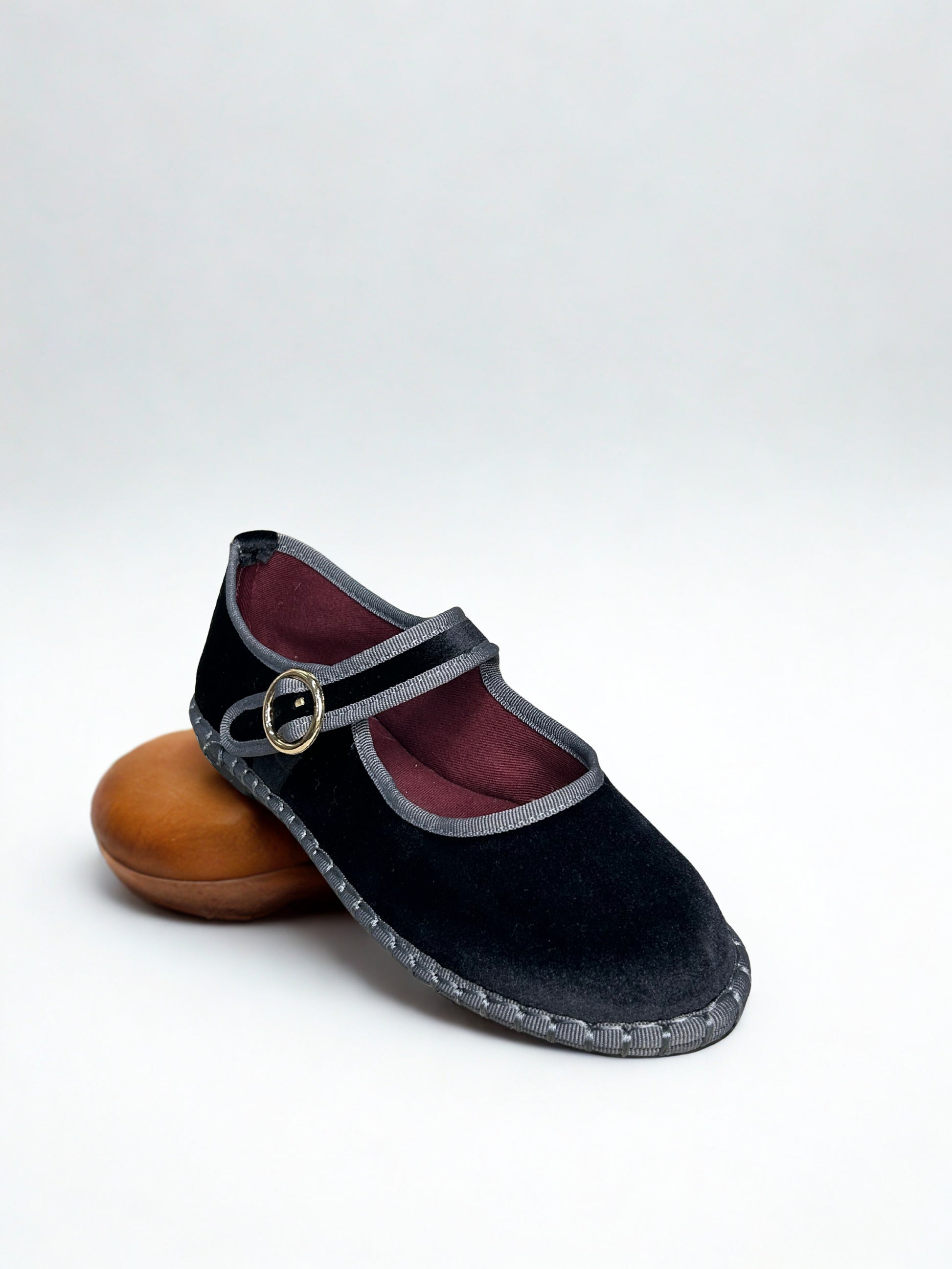 Velvet Mary Jane-style shoe with a ribbon and belt closure. Flat, flexible sole. Available in brown/wine, wine/wine, green, black/grey, sapphire blue, and purple/pink.