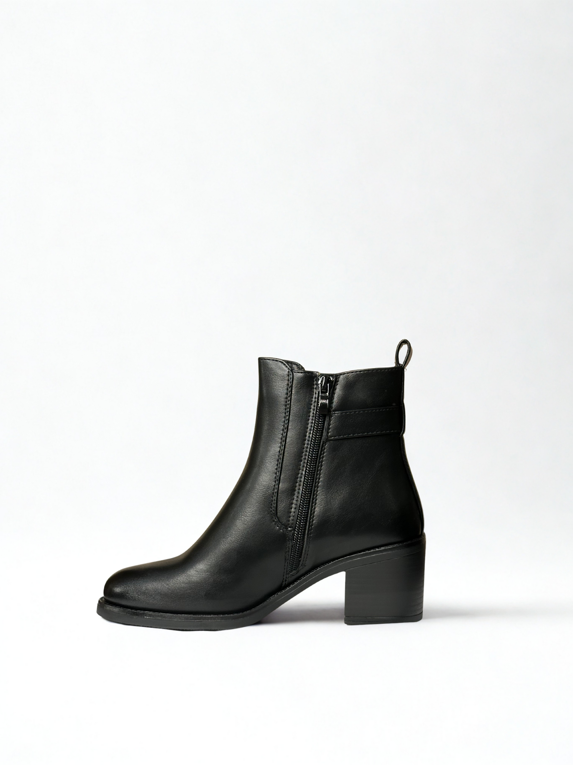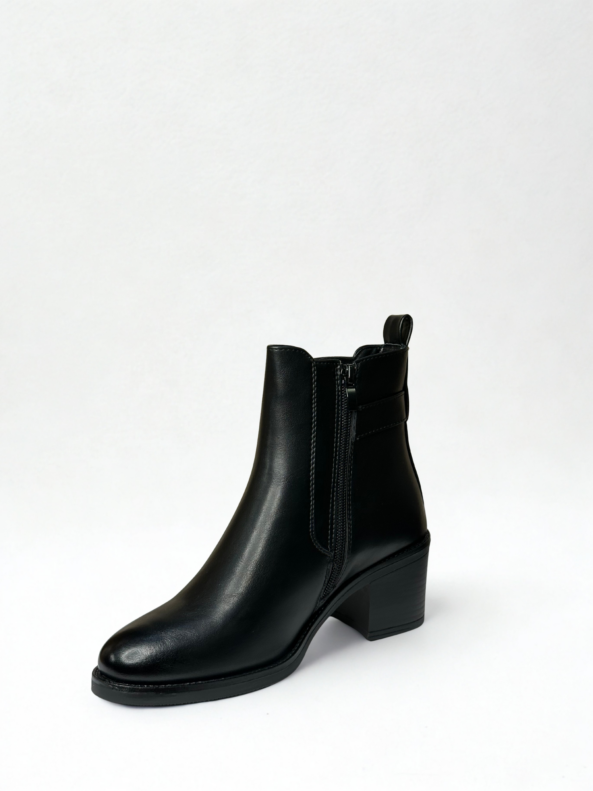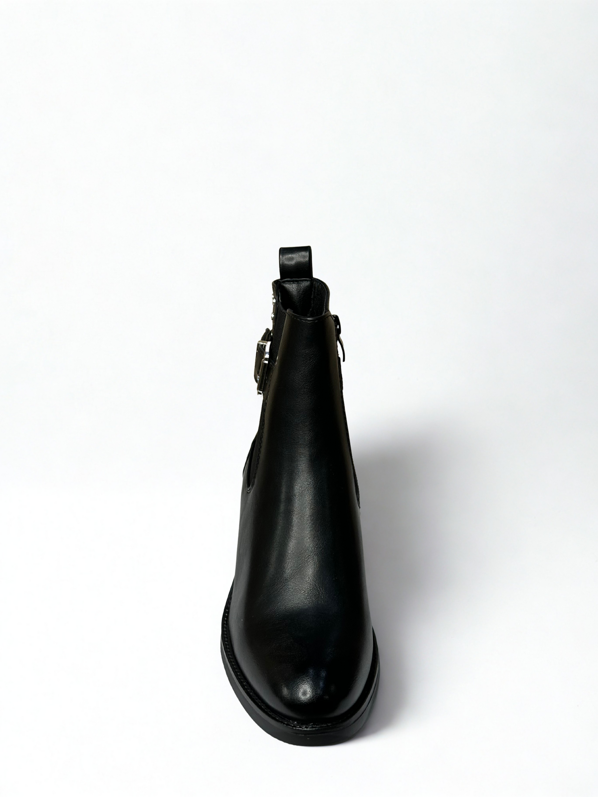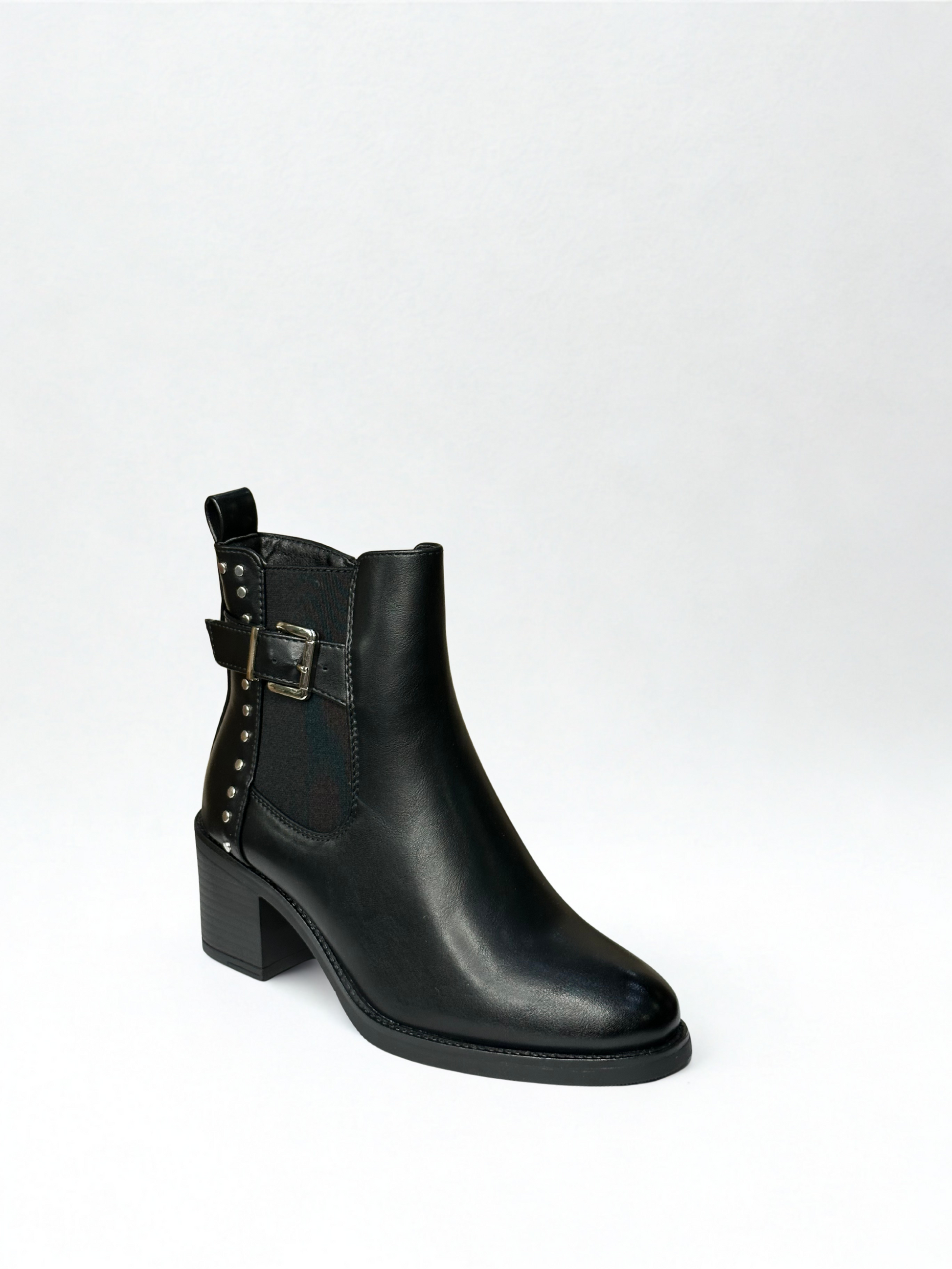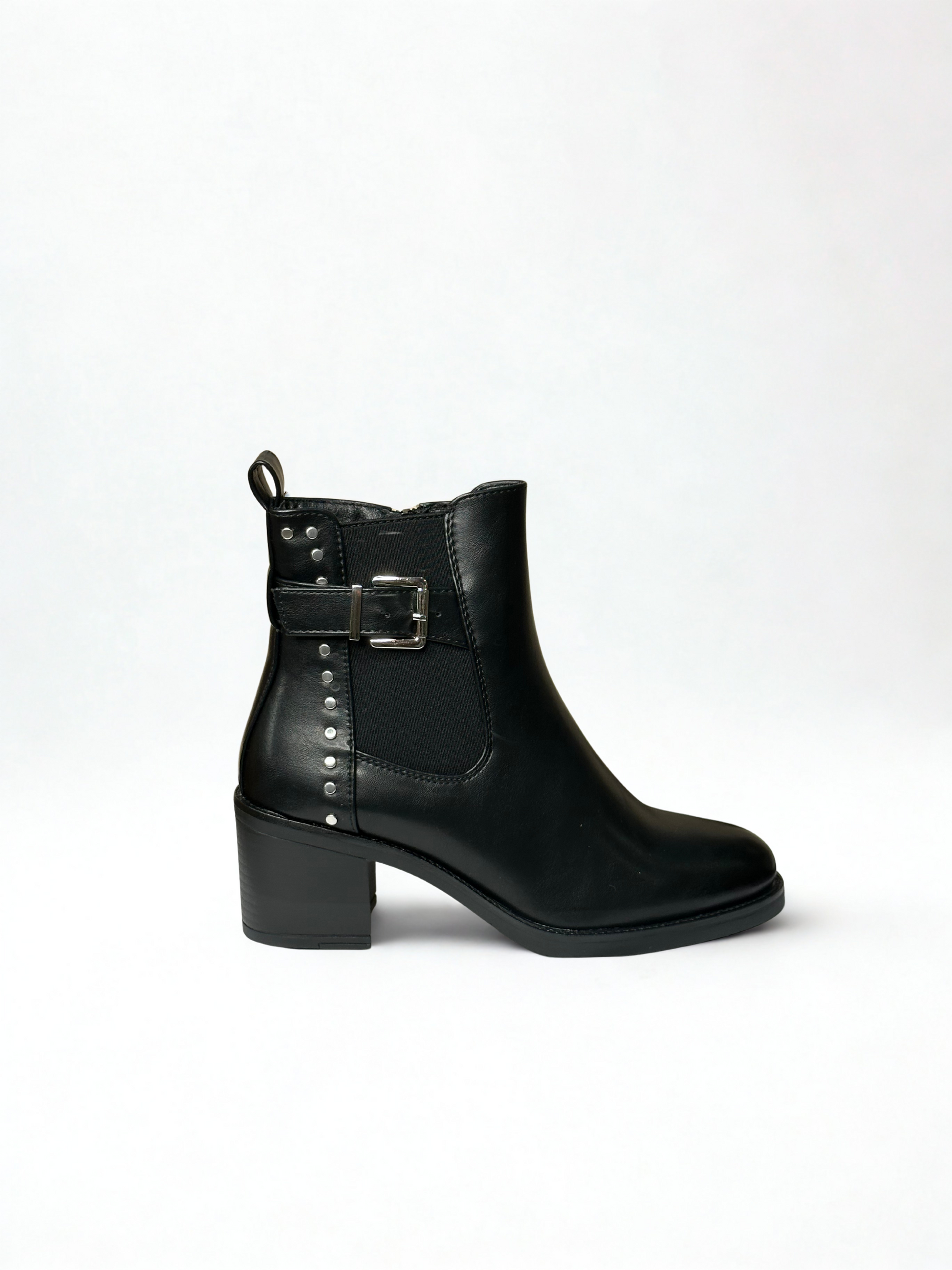 Botín efecto piel con elástico, detalle cinturón en lateral y tachas. Cierre con cremallera lateral. Disponible en color negro y camel.