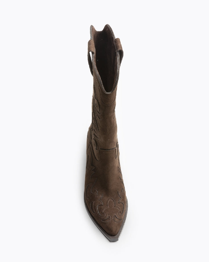 Bota estilo cowboy con detalles bordados. Acabado en punta. Cierre cremallera. Tacón cubano cuadrado ancho. Disponible en color café y camel.