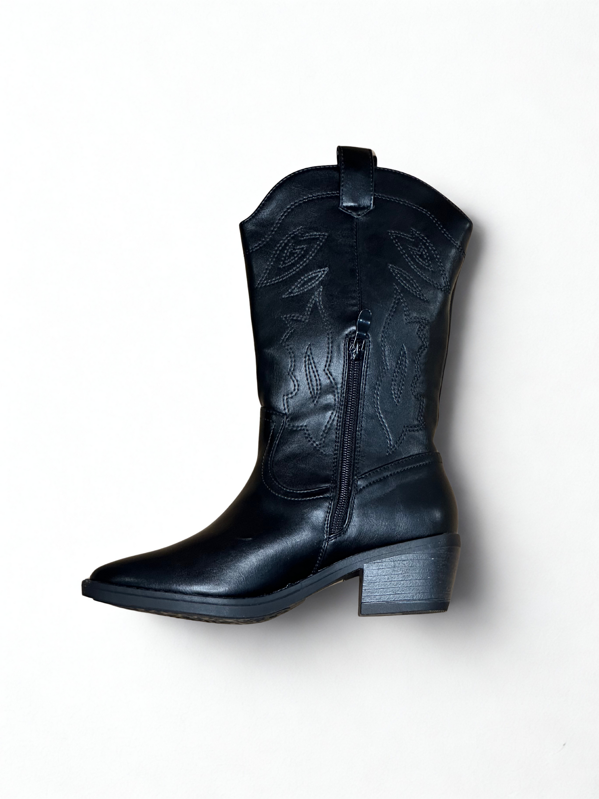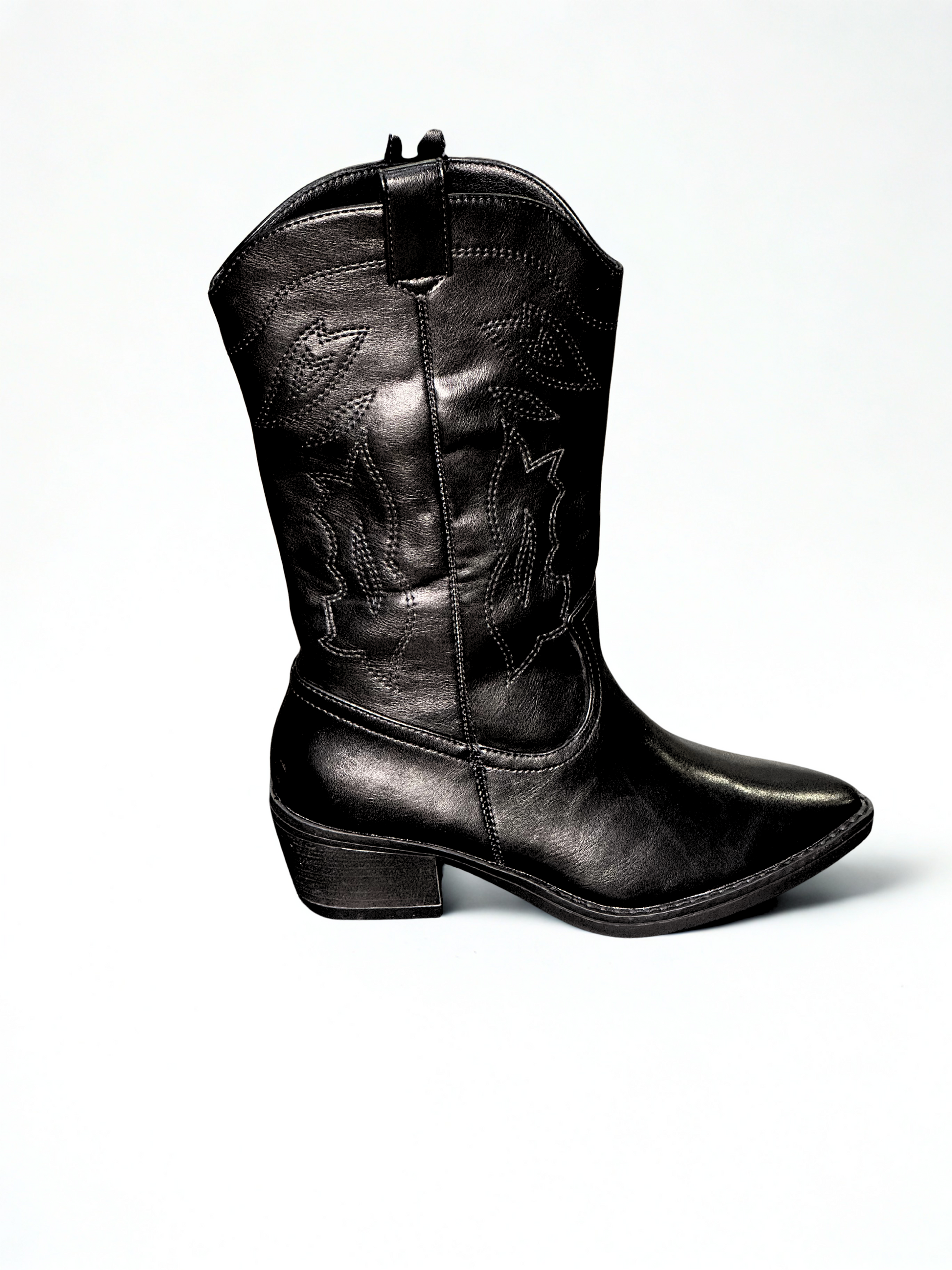Bota cowboy de caña media alta, dibujo en bordado y con tacón ancho medio. Cierre con media cremallera y suela de goma. Disponible en color negro y kaki.
