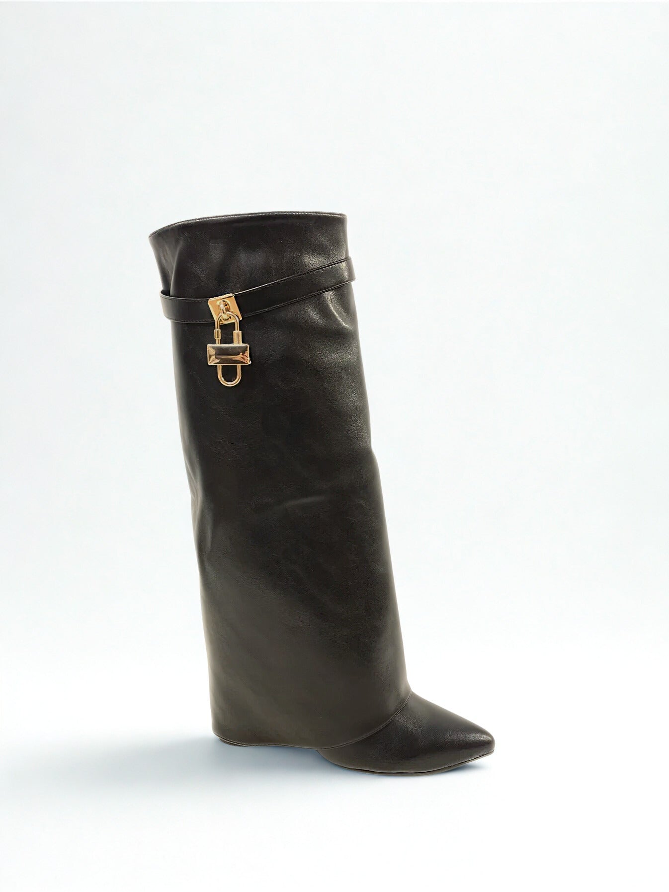 Bota de caña alta con solapa, detalle de candado en el lateral. Tacón cuadrado y cierre con cremallera. Disponible en color negro.