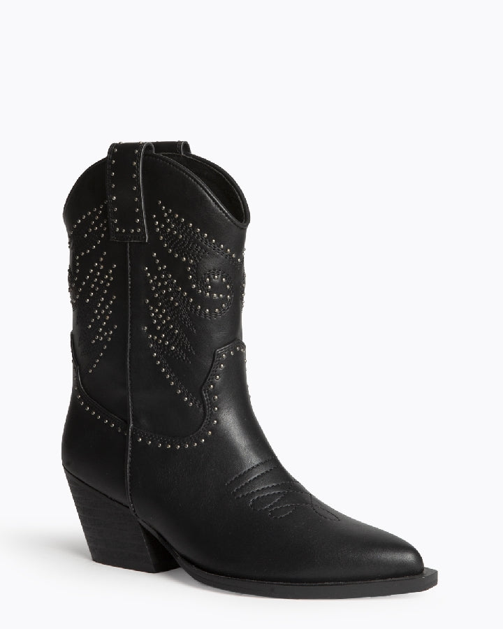Botin estilo cowboy con detalles de tachuelas y bordado. Acabado en punta. Cierre cremallera. Tacón cubano cuadrado ancho. Disponible en color negro en caña alta y baja.