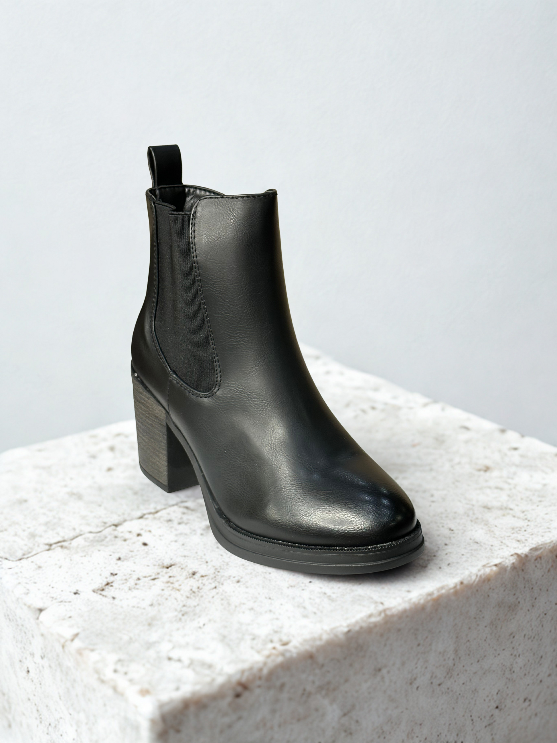 Botín efecto piel con elástico y cierre lateral. Tacón efecto madera negra. Disponible en color negro.
