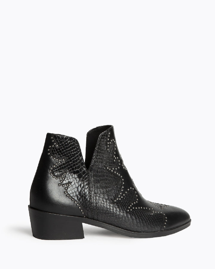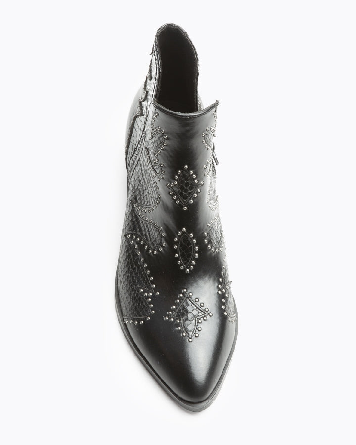 Botín tacón bajo, estilo cowboy. Cierre con cremallera en el lateral. Acabado en punta. Detalle de tachas en el corte.