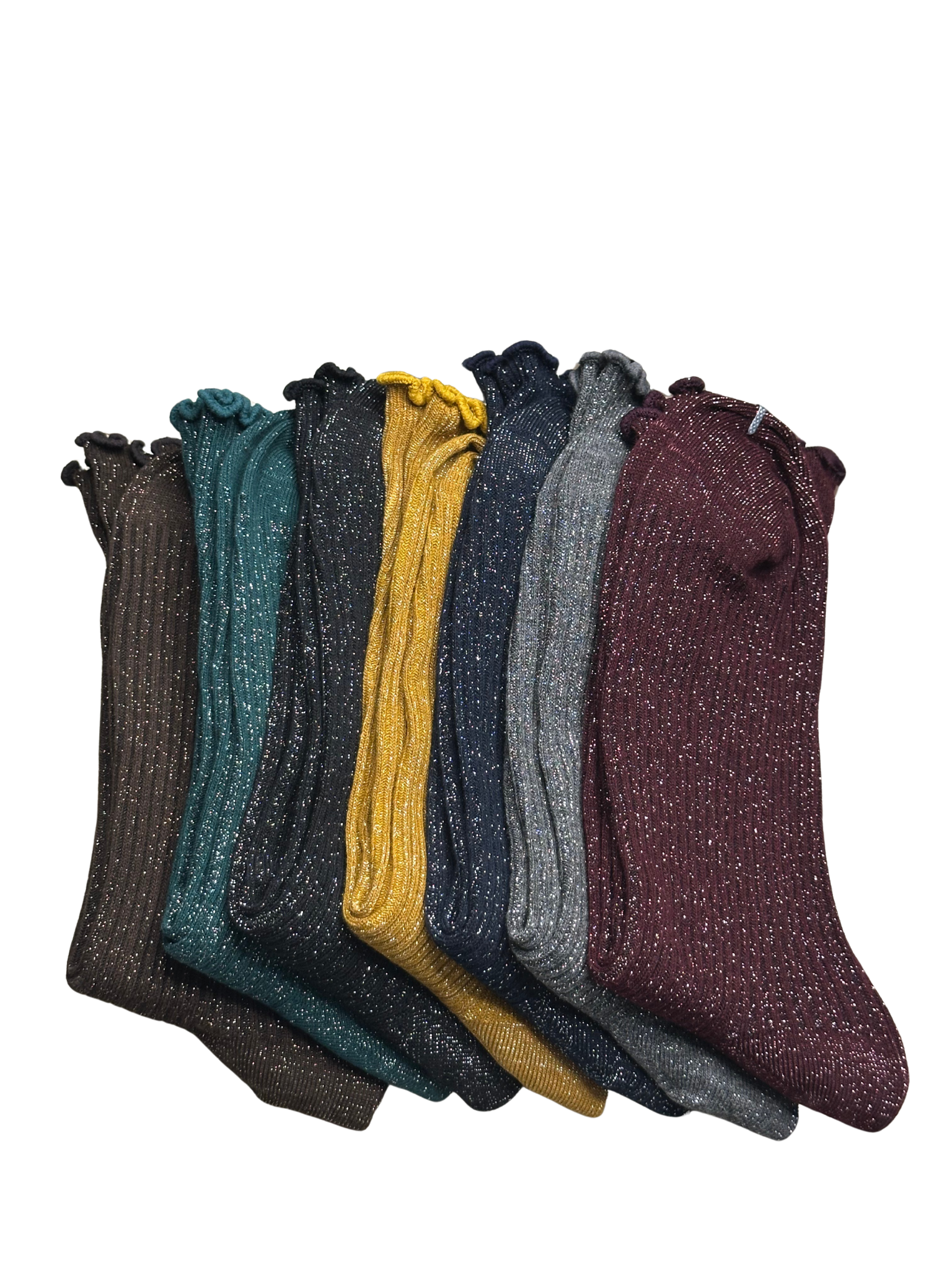 Calcetines en punto de canalé con con brillos y ribete sobrehilado. Disponible en color chocolate, verde, negro, amarillo, azul, gris y burdeos.