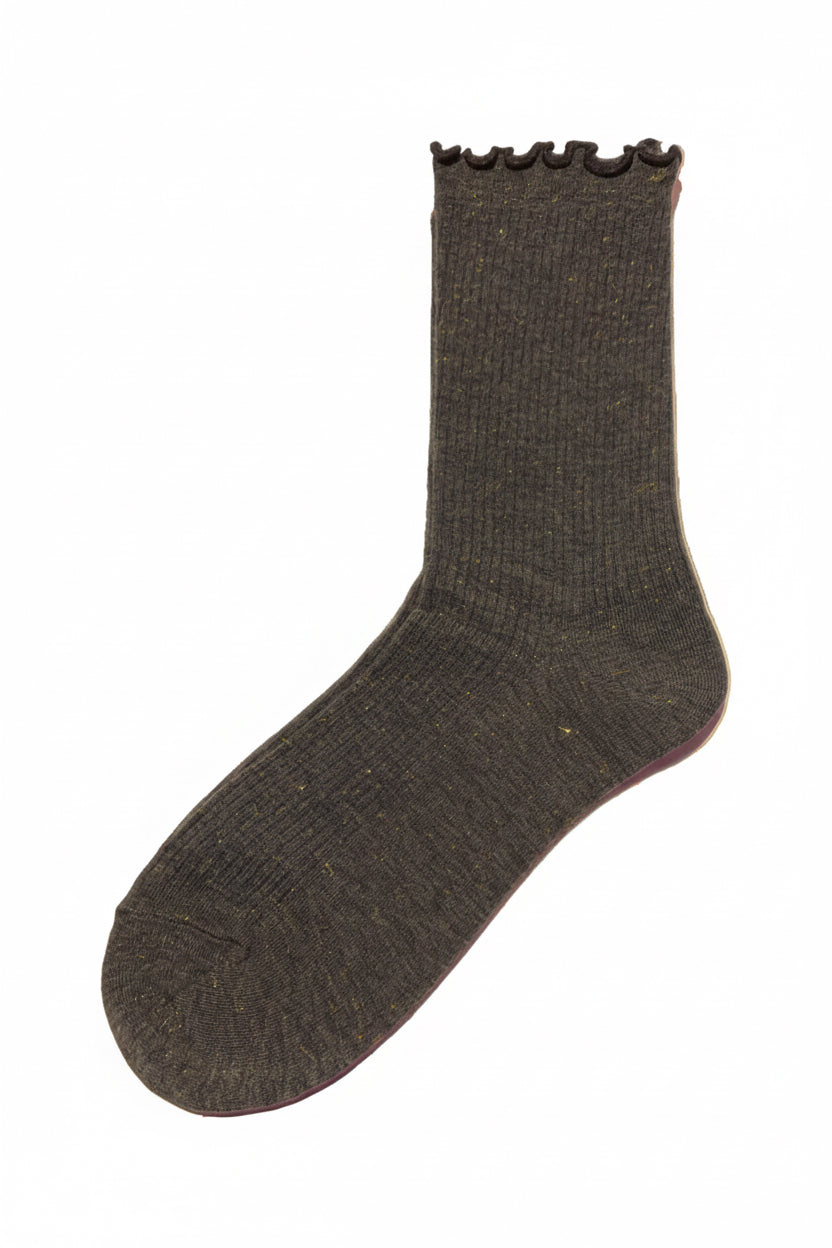 Calcetines en punto de canalé con hilo de lurex y ribete sobrehilado. Disponible en varios colores, perfectos para combinar con tus merceditas, loafers y zapatillas.