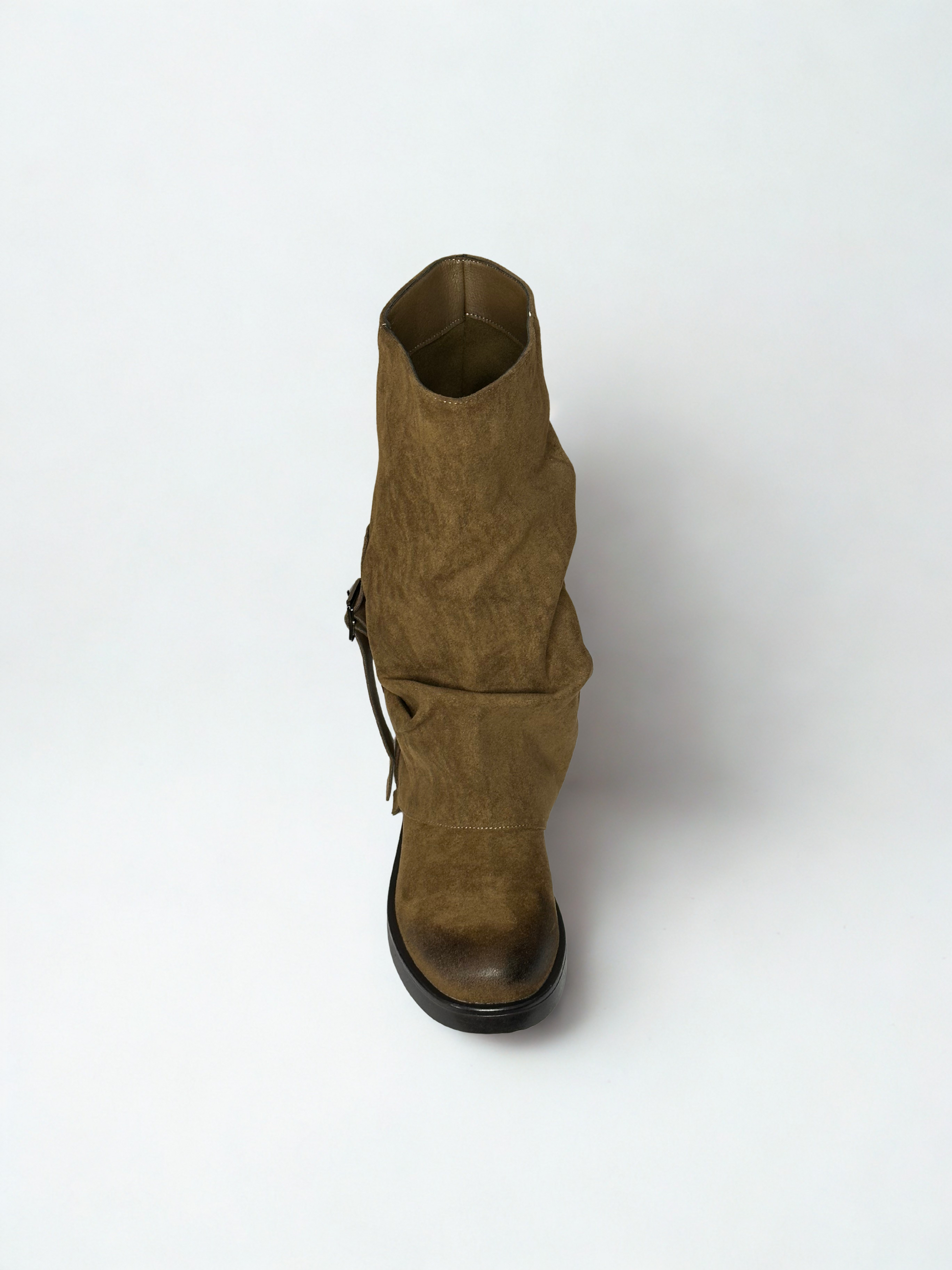 Bota de caña alta estilo biker con solapa y punta redonda, detalle de hebilla en el lateral. Cierre con cremallera. Disponible en color marrón.