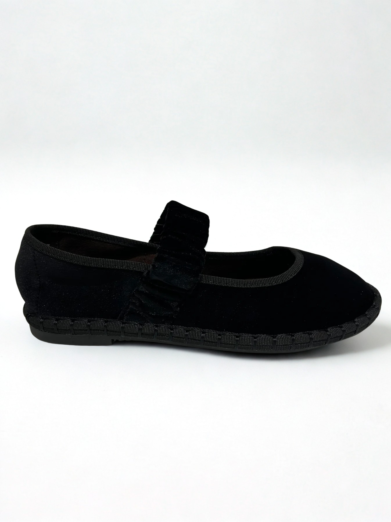 Zapato estilo Merceditas en terciopelo con cinturón elástico ancho en empeine. Suela plana y flexible. Disponible en color negro, brown, magenta, Lt brown, wine, grey, mousse, multi y blue/grey.Materiales: terciopelo y textil
