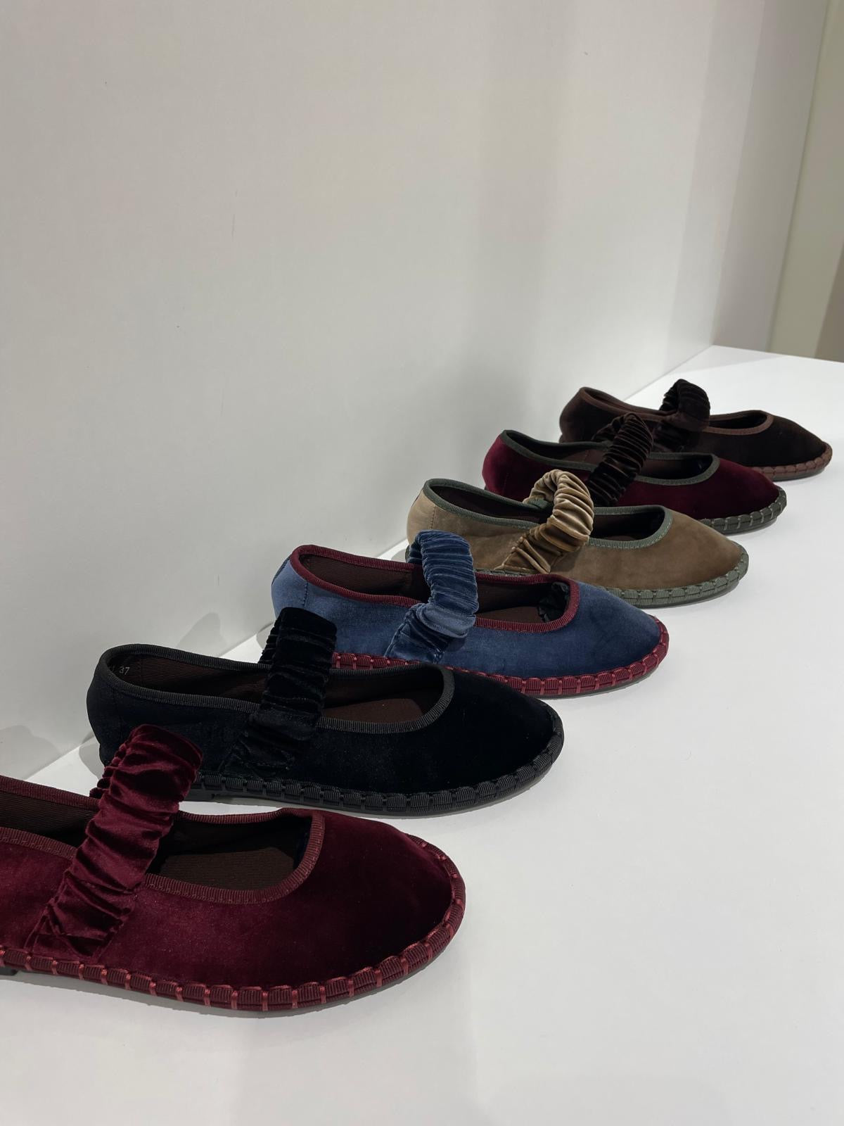 Zapato estilo Merceditas en terciopelo con cinturón elástico ancho en empeine. Suela plana y flexible. Disponible en color negro, magenta, brown, wine y grey.