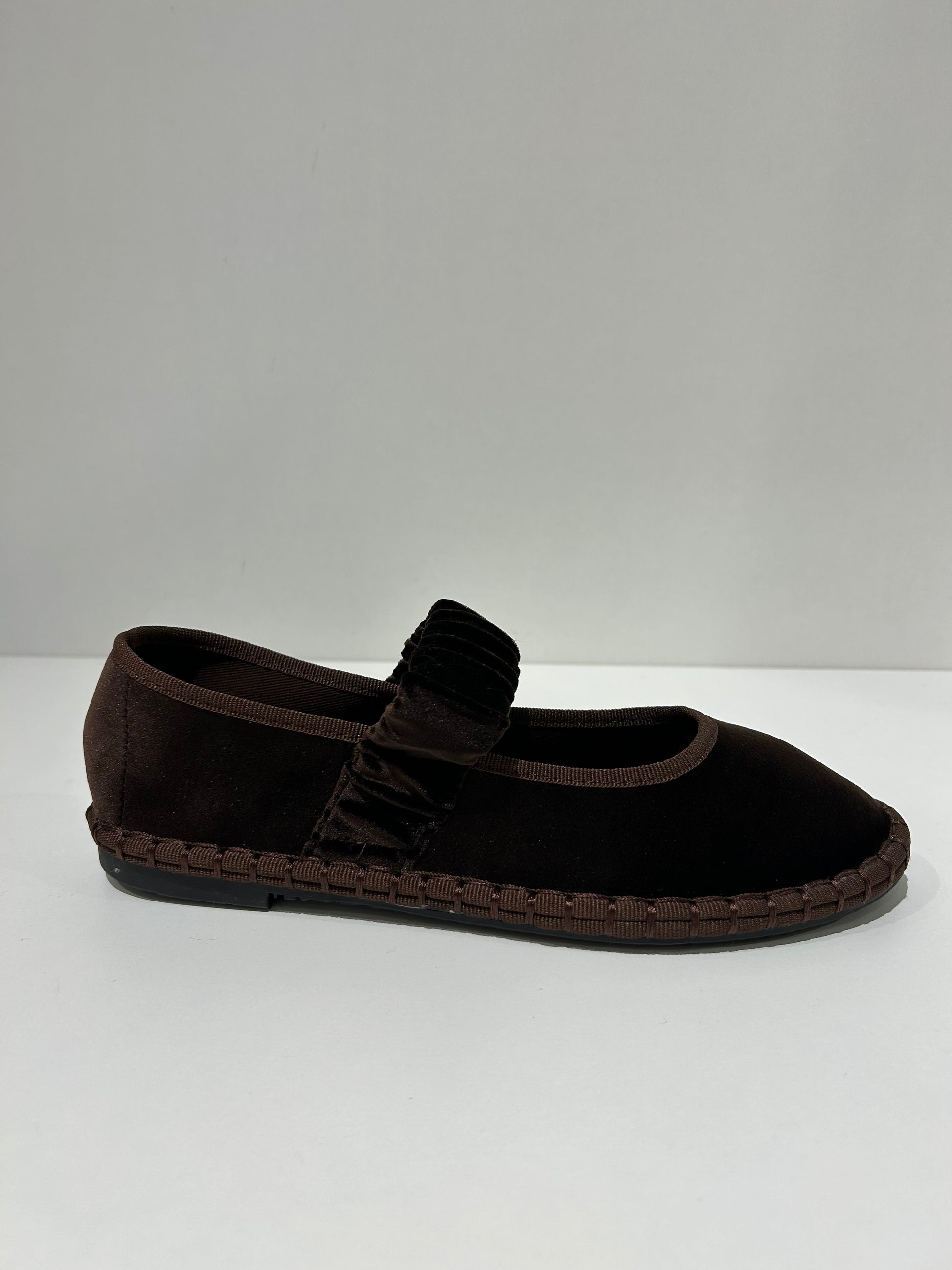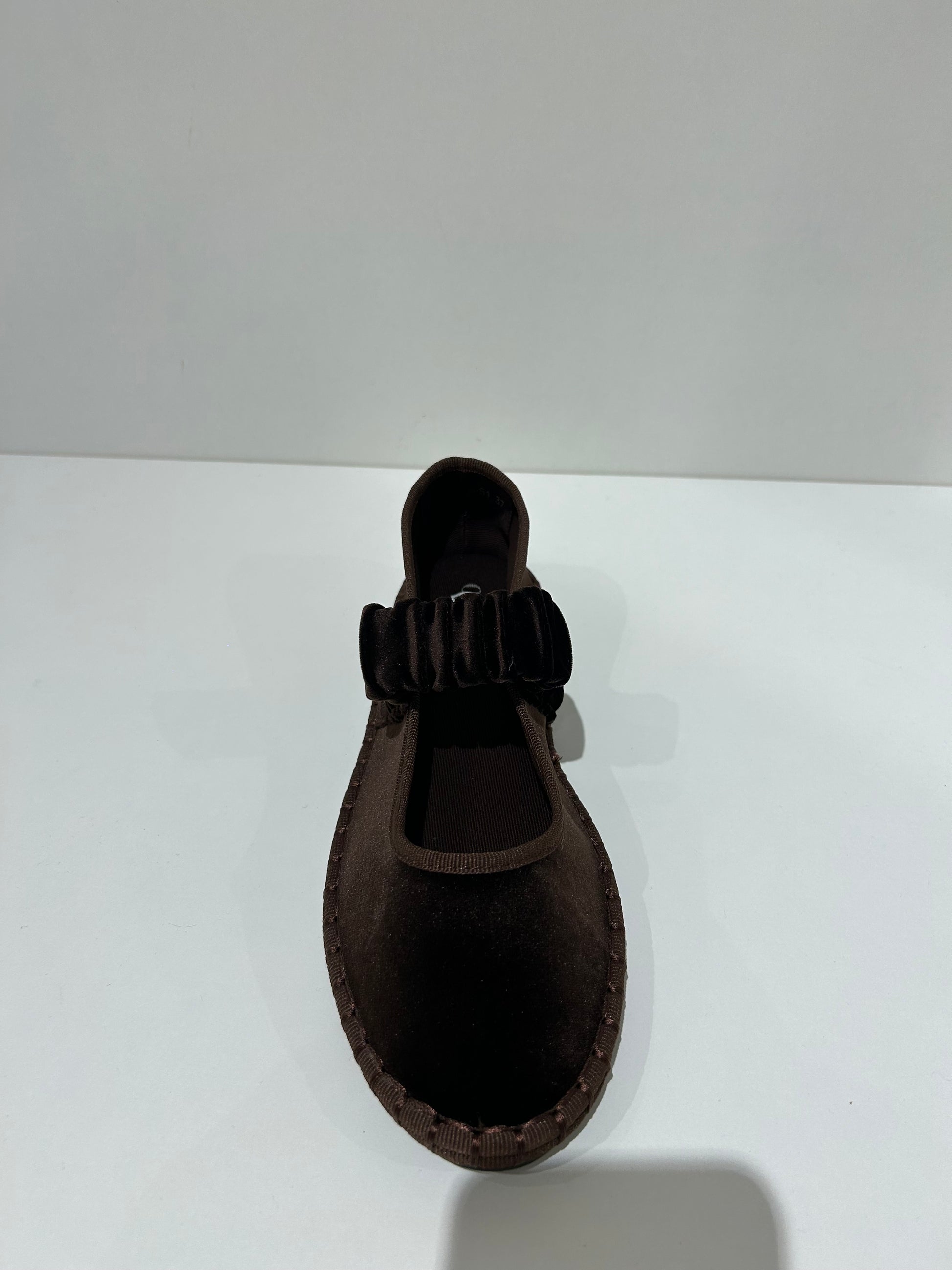 Zapato estilo Merceditas en terciopelo con cinturón elástico ancho en empeine. Suela plana y flexible. Disponible en color negro, brown, magenta, Lt brown, wine, grey, mousse, multi y blue/grey..