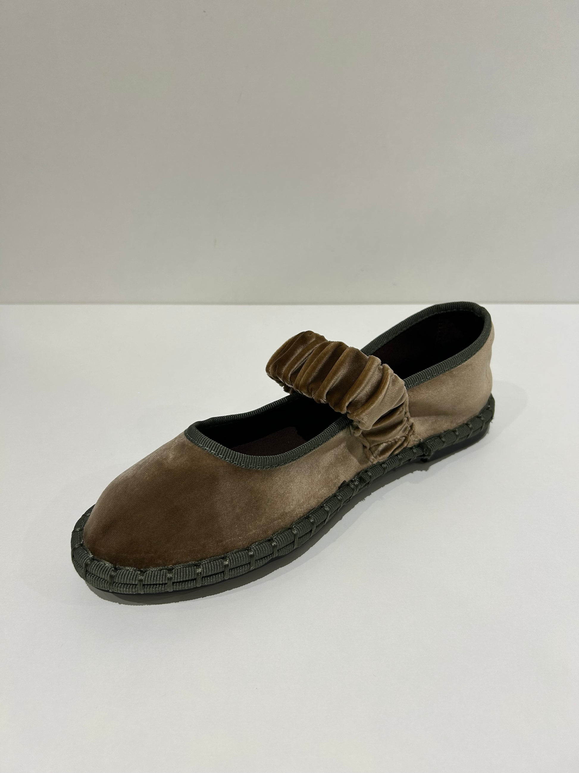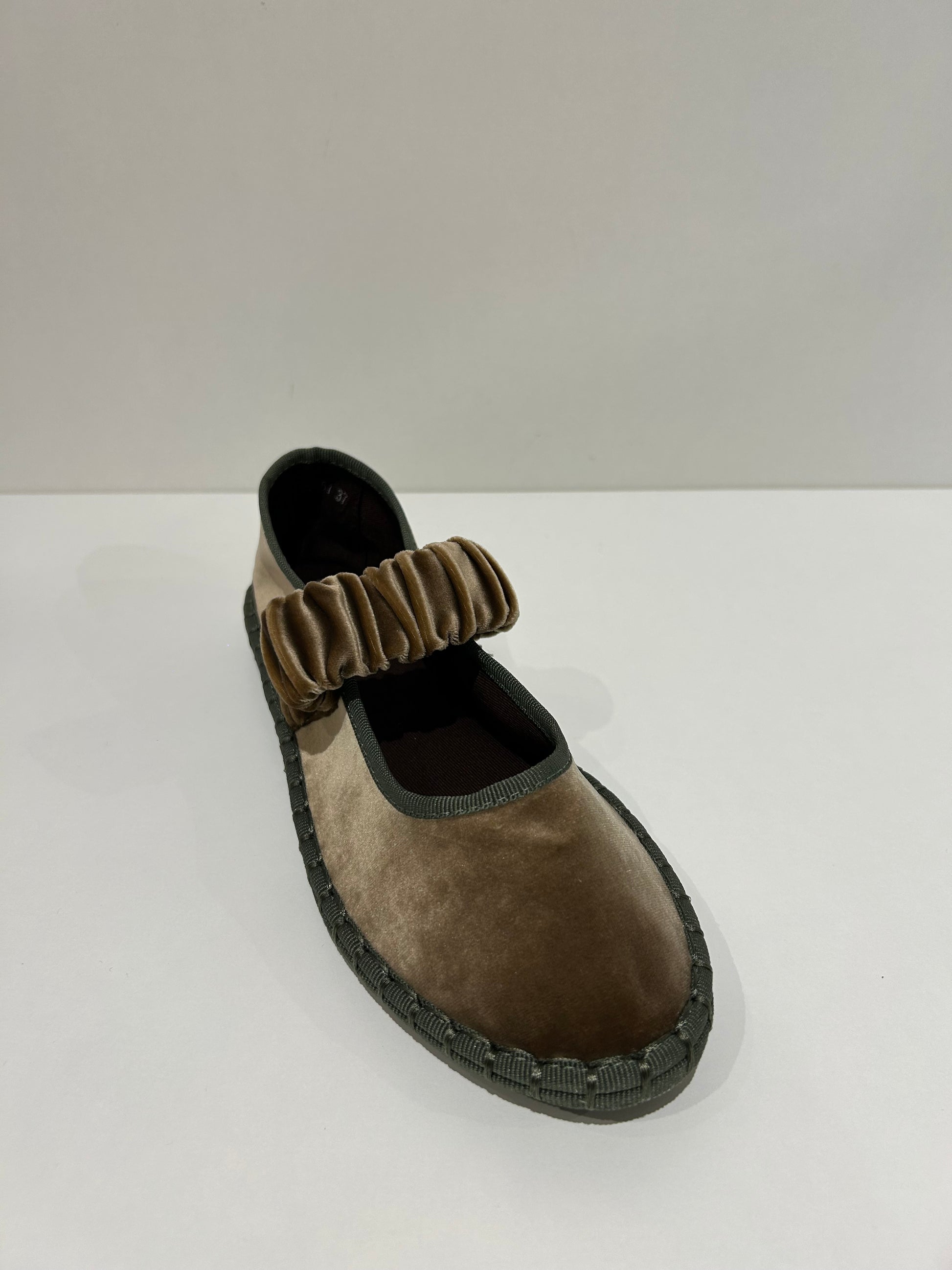 Zapato estilo Merceditas en terciopelo con cinturón elástico ancho en empeine. Suela plana y flexible. Disponible en color negro, brown, magenta, Lt brown, wine, grey, mousse, multi y blue/grey.