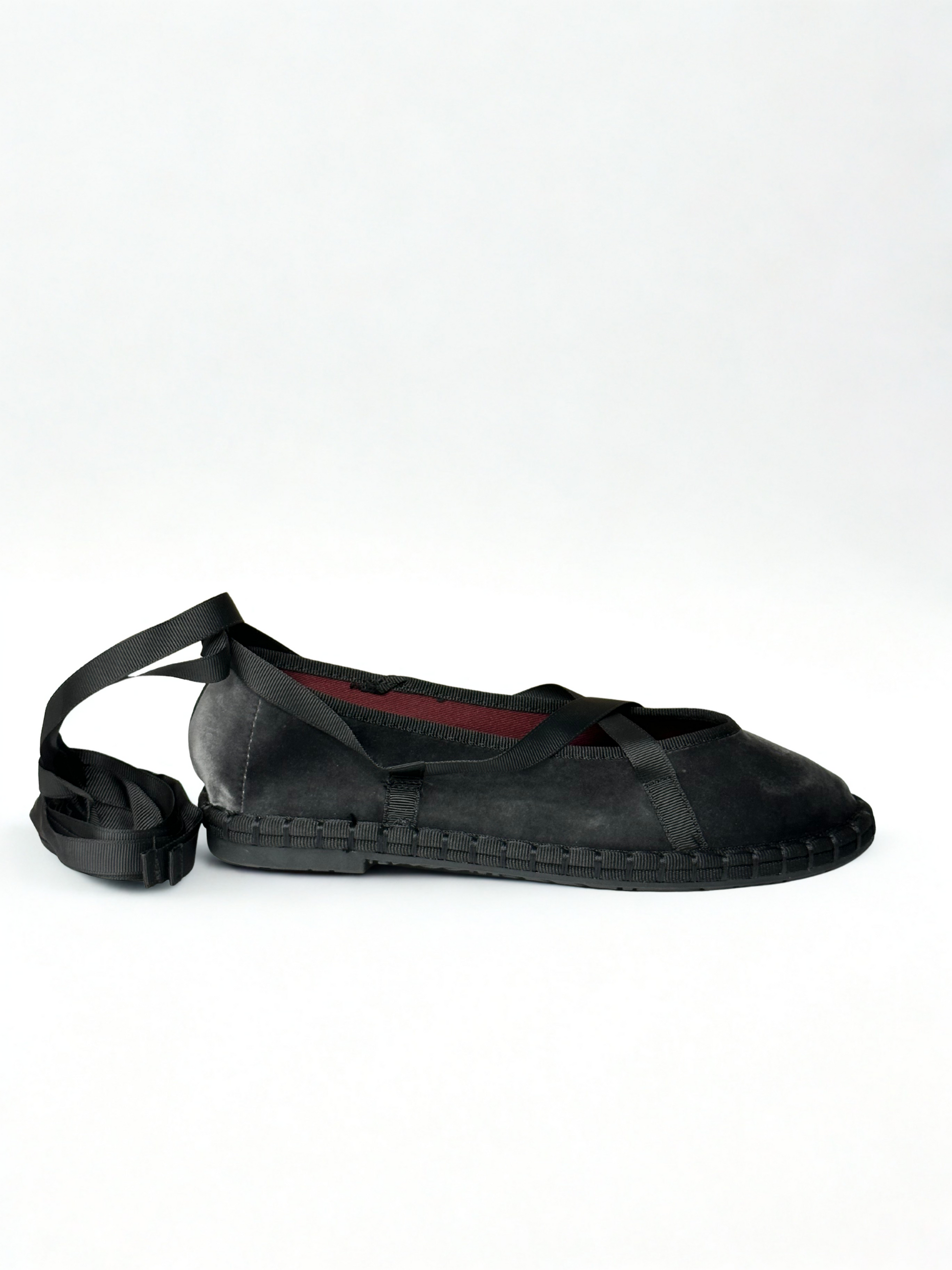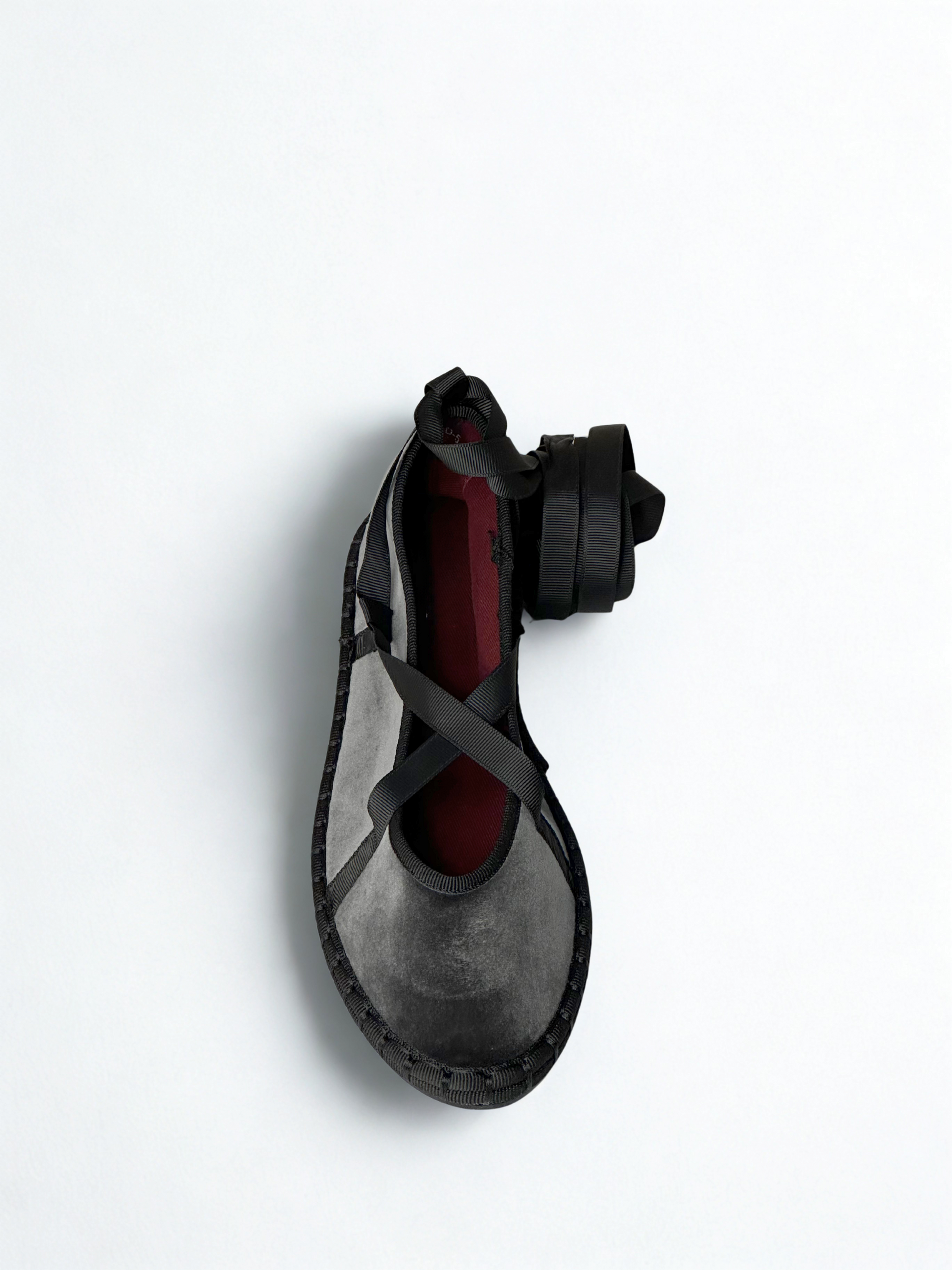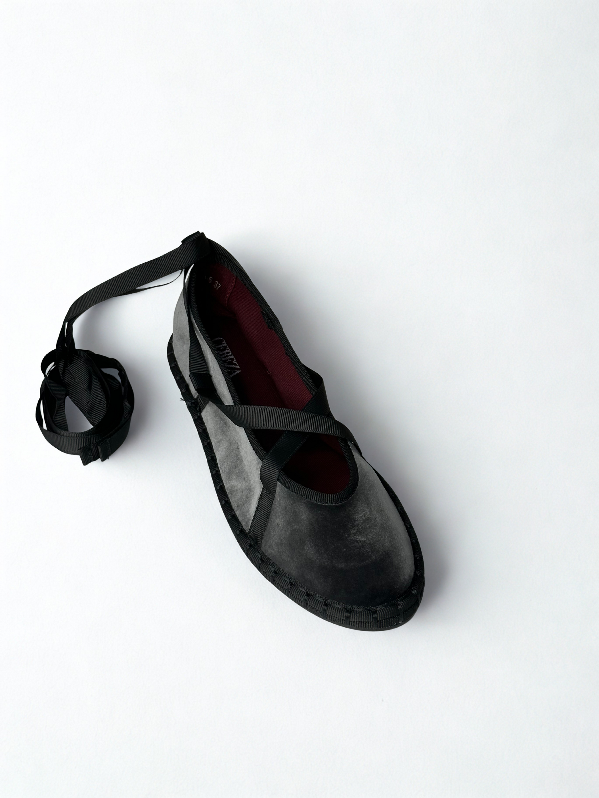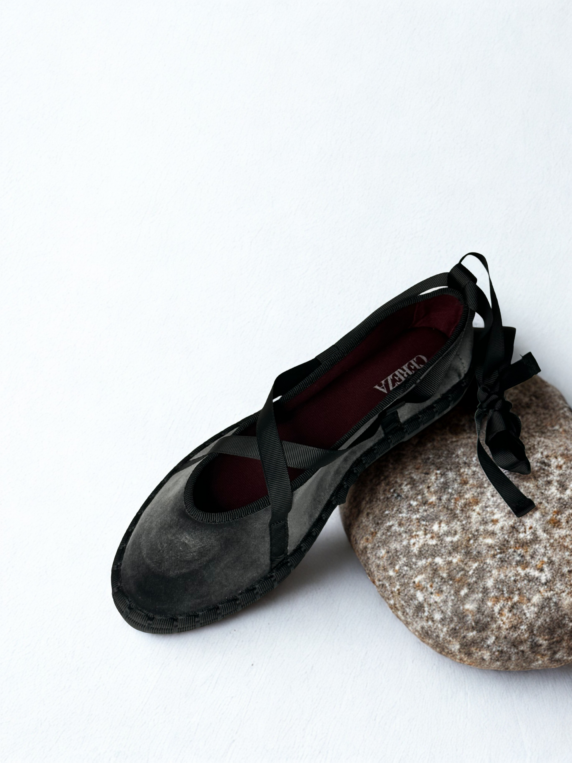 Zapato estilo Merceditas en terciopelo con cinta cruzada en empeine y cierre lazo. Suela plana y flexible. Disponible en color azul, gris, rosa y verde oliva, .