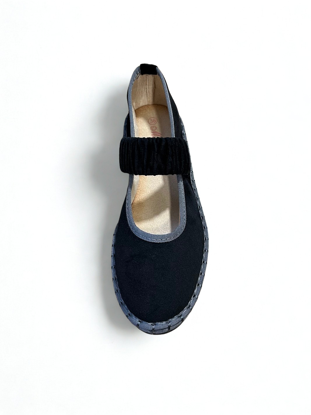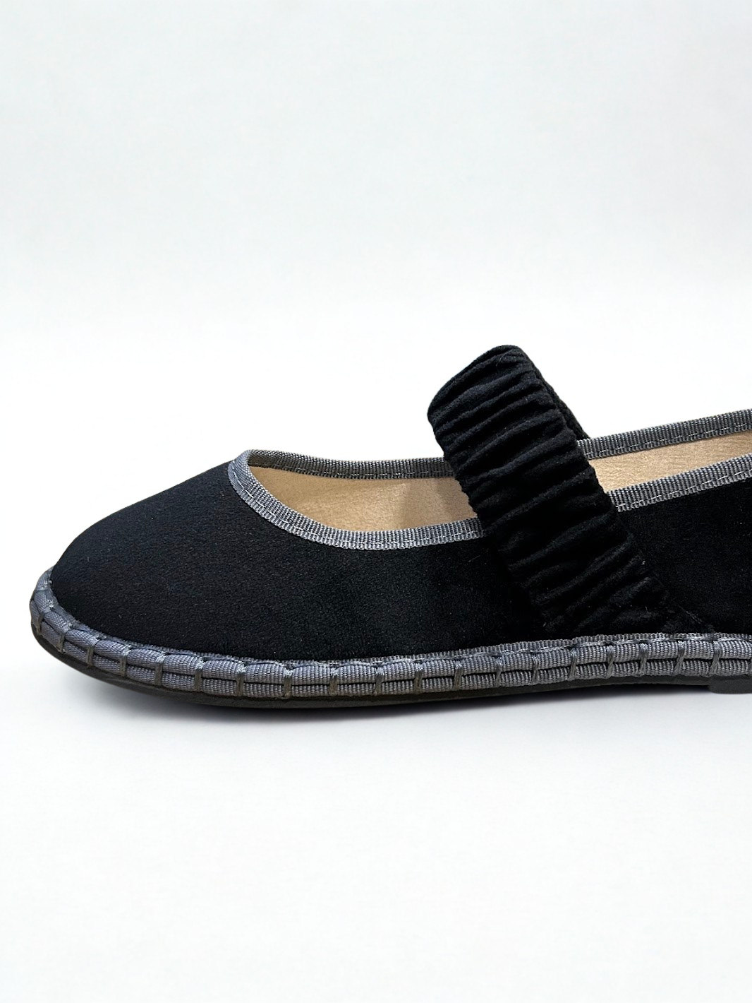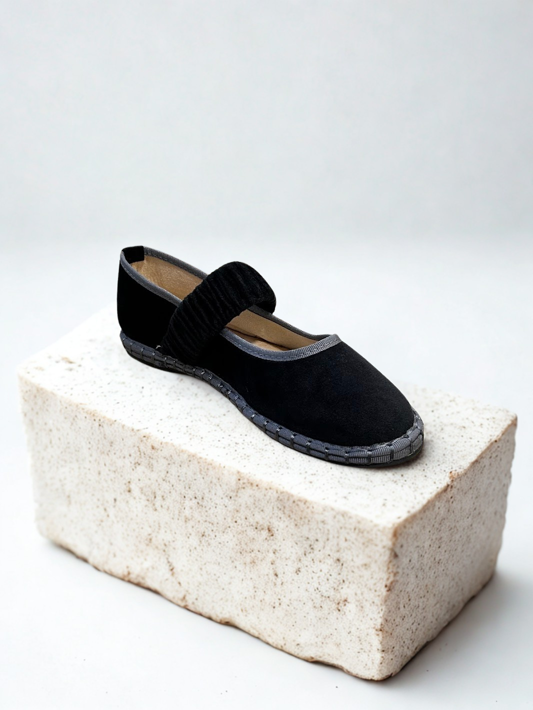 Zapato estilo Merceditas en terciopelo con cinturón elástico ancho en empeine. Suela plana y flexible. Disponible en color black, pink, wine y grey.