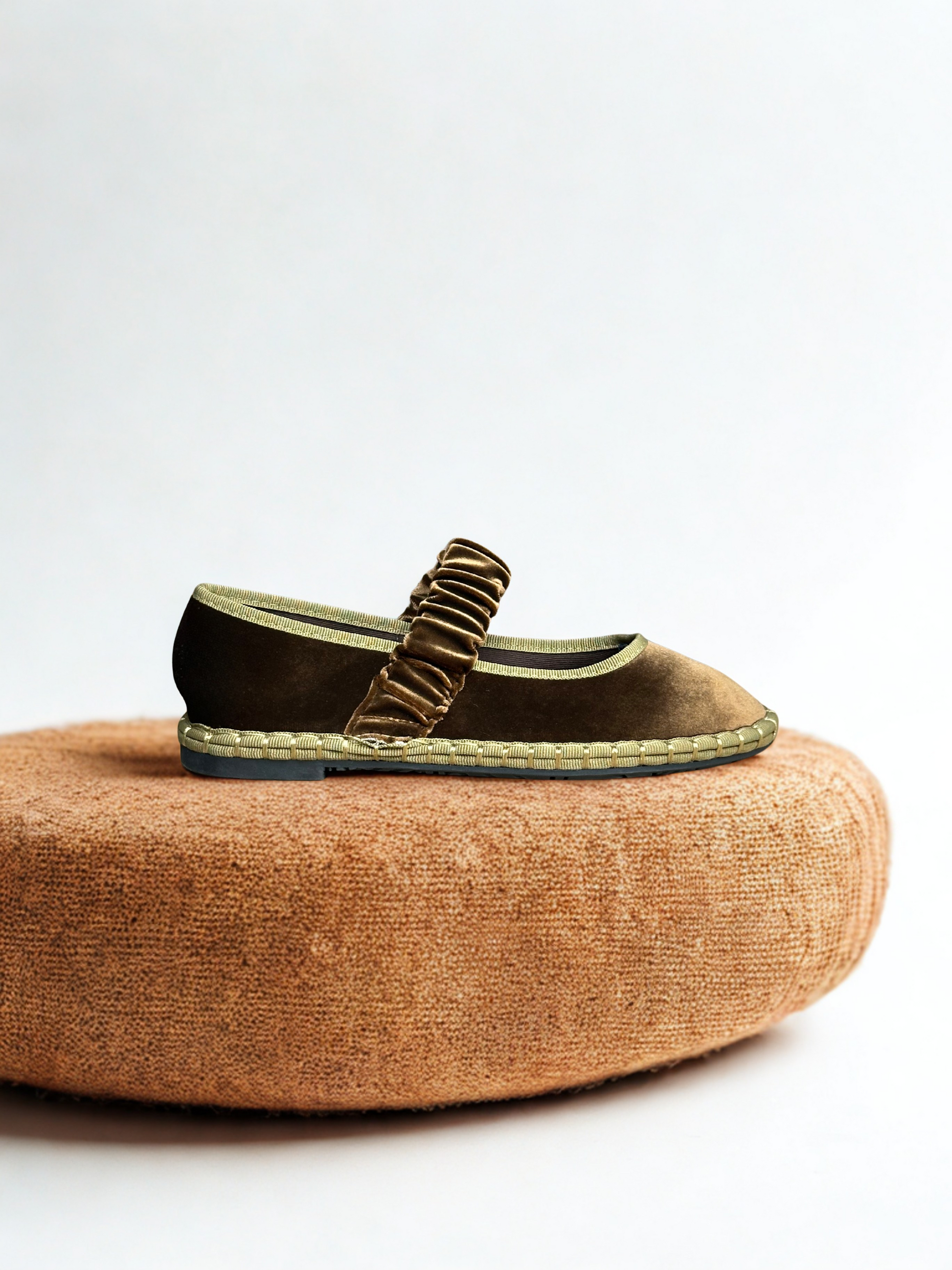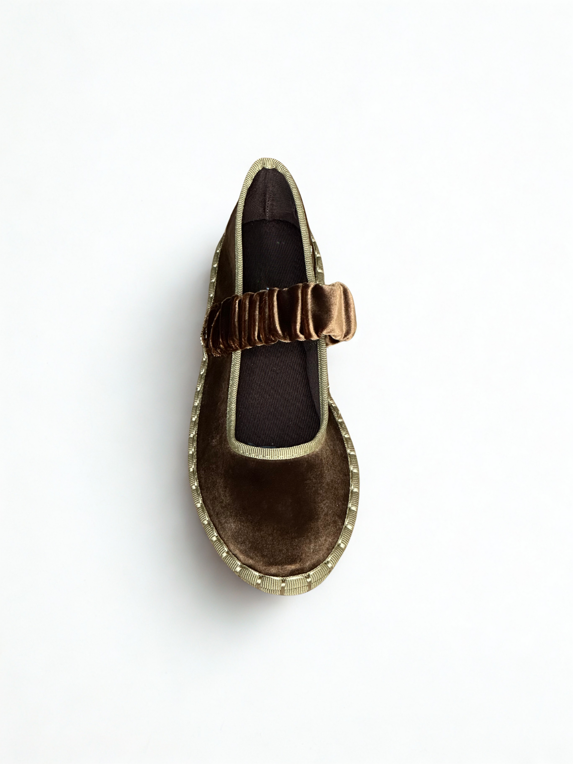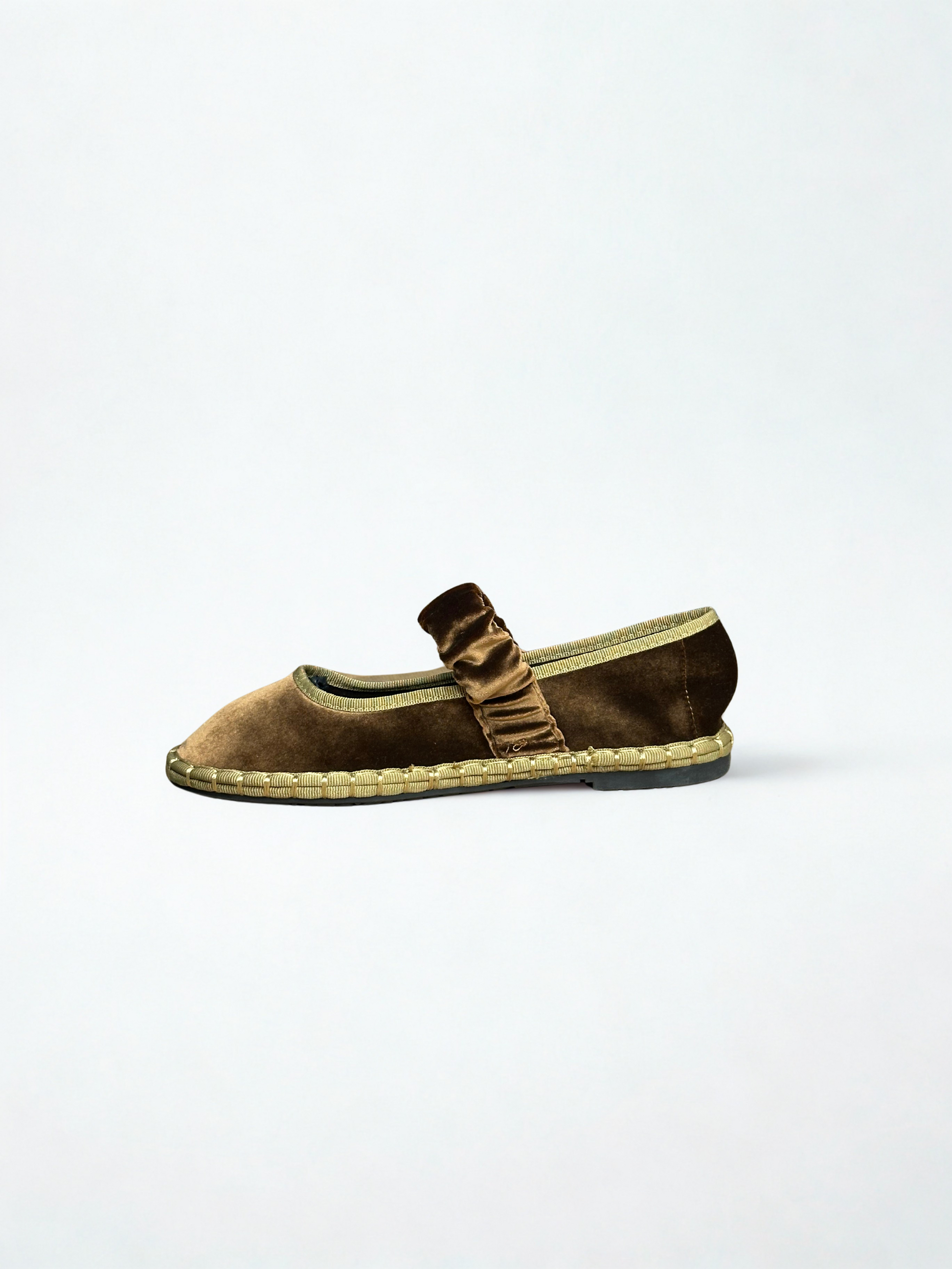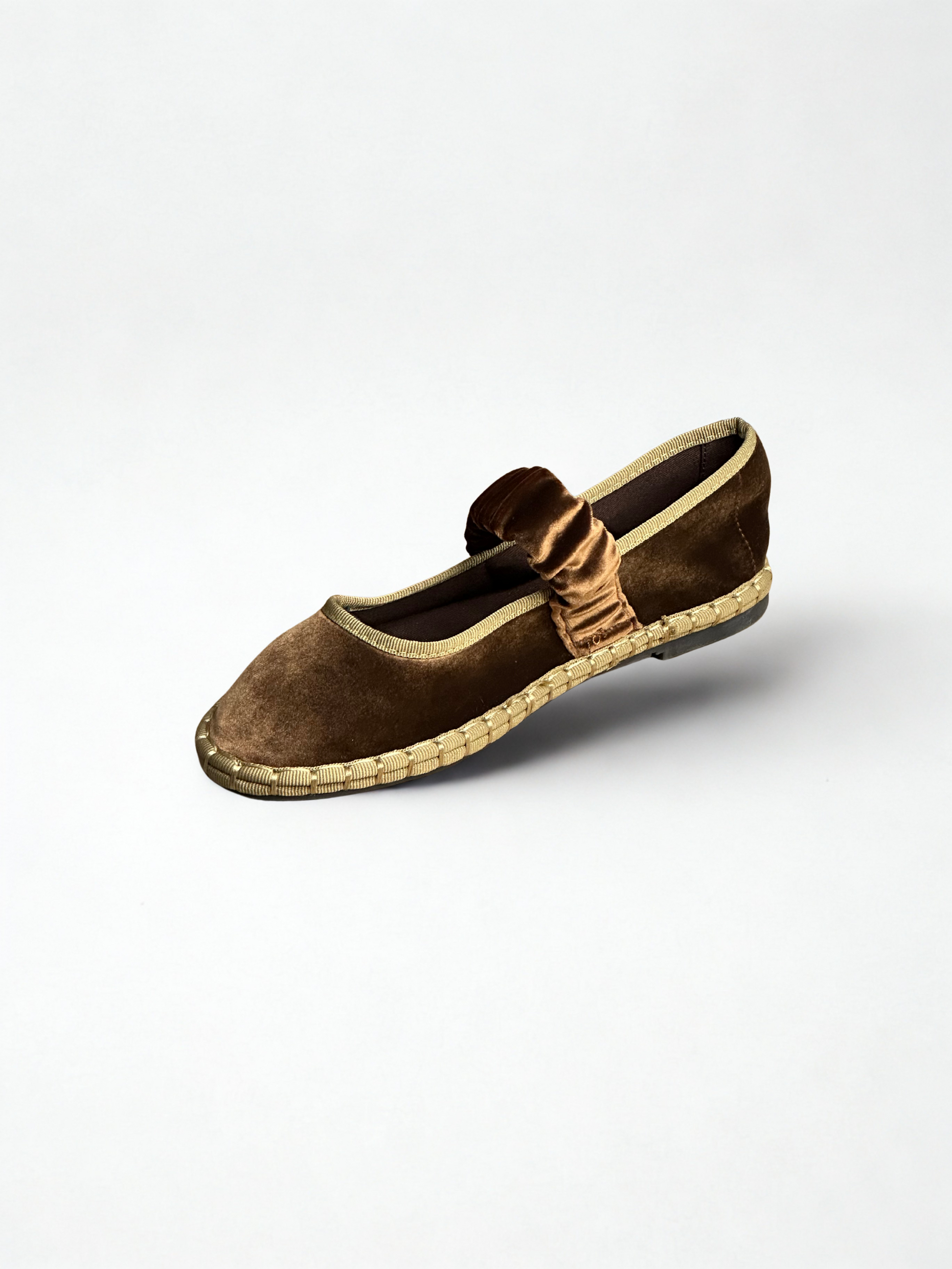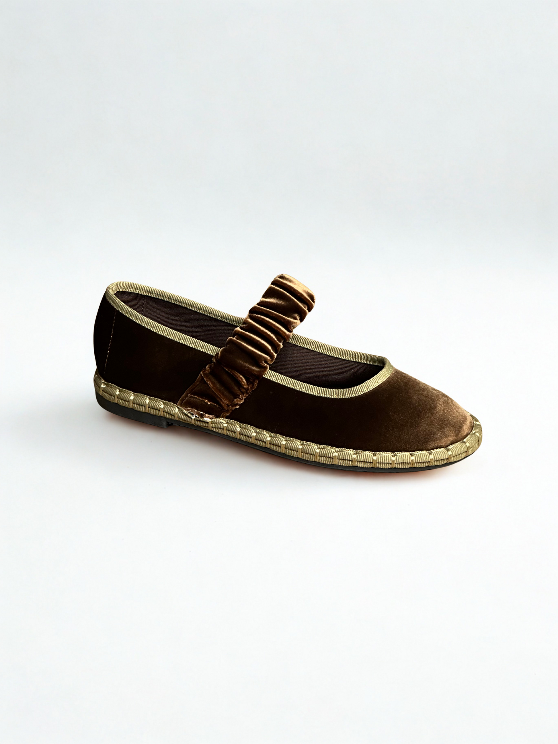 Zapato estilo Merceditas en terciopelo con cinturón elástico ancho en empeine. Suela plana y flexible. Disponible en color negro, brown, magenta, Lt brown, wine, grey, mousse, multi y blue/grey.