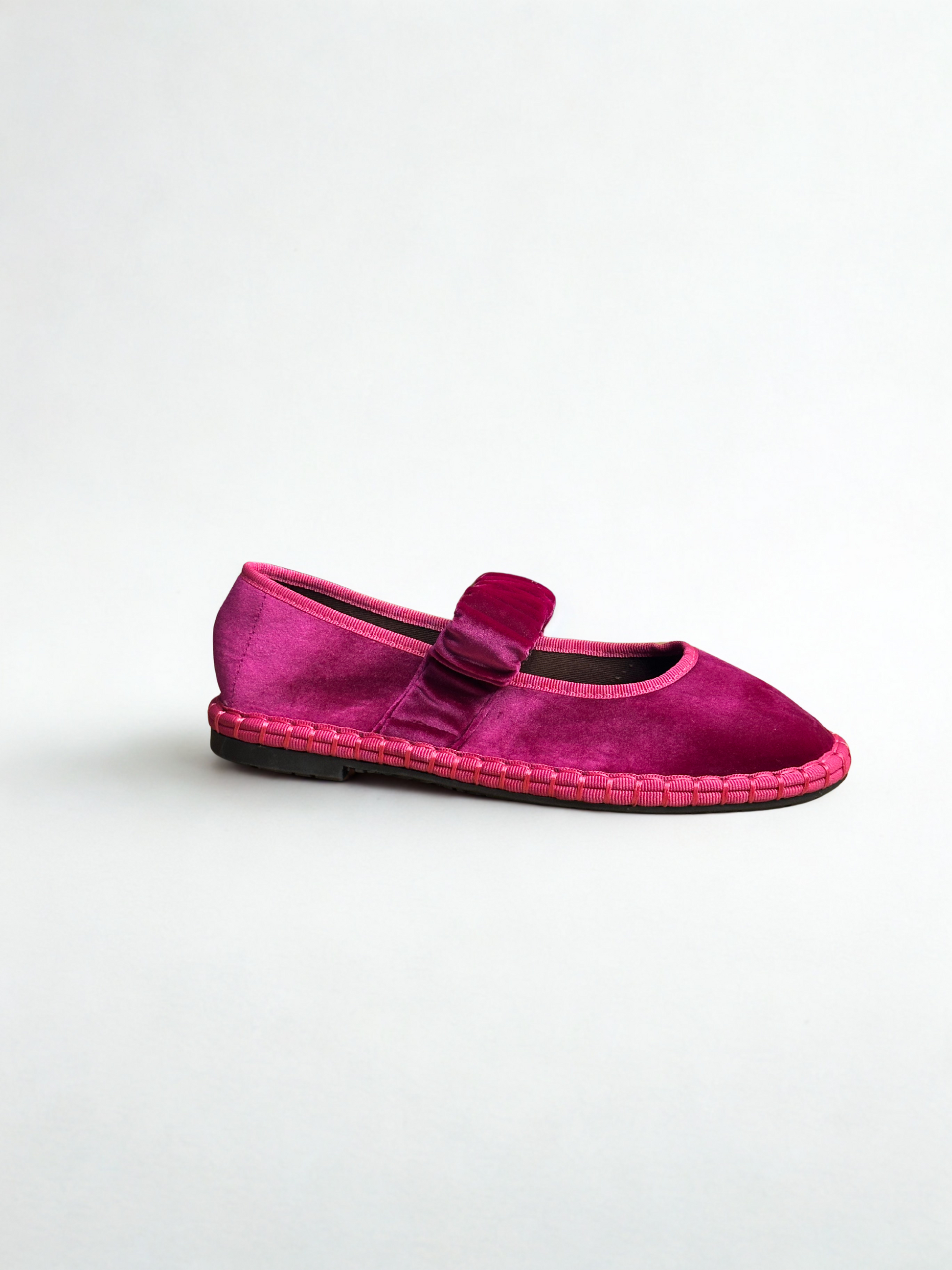 Zapato estilo Merceditas en terciopelo con cinturón elástico ancho en empeine. Suela plana y flexible. Disponible en color negro, brown, magenta, Lt brown, wine, grey, mousse, multi y blue/grey.