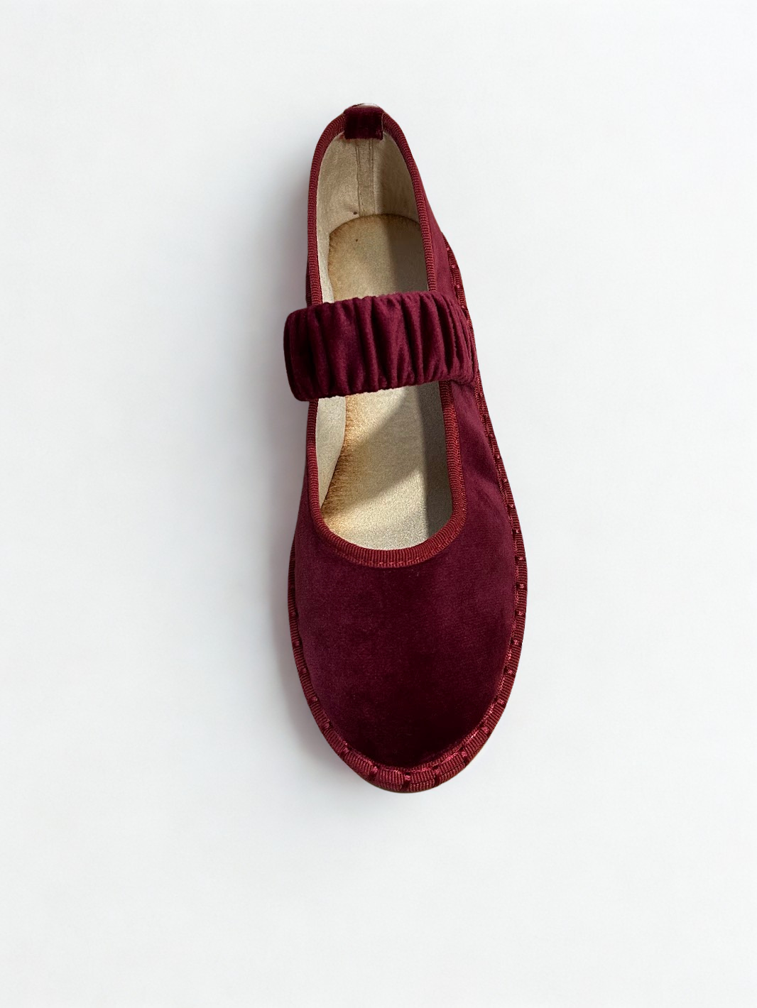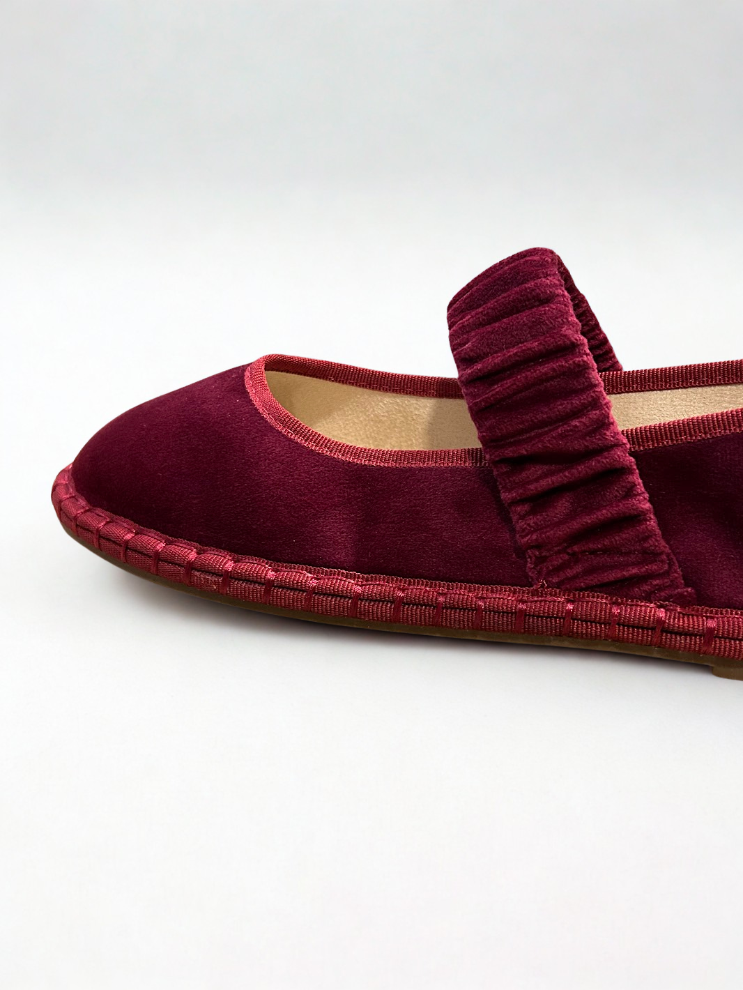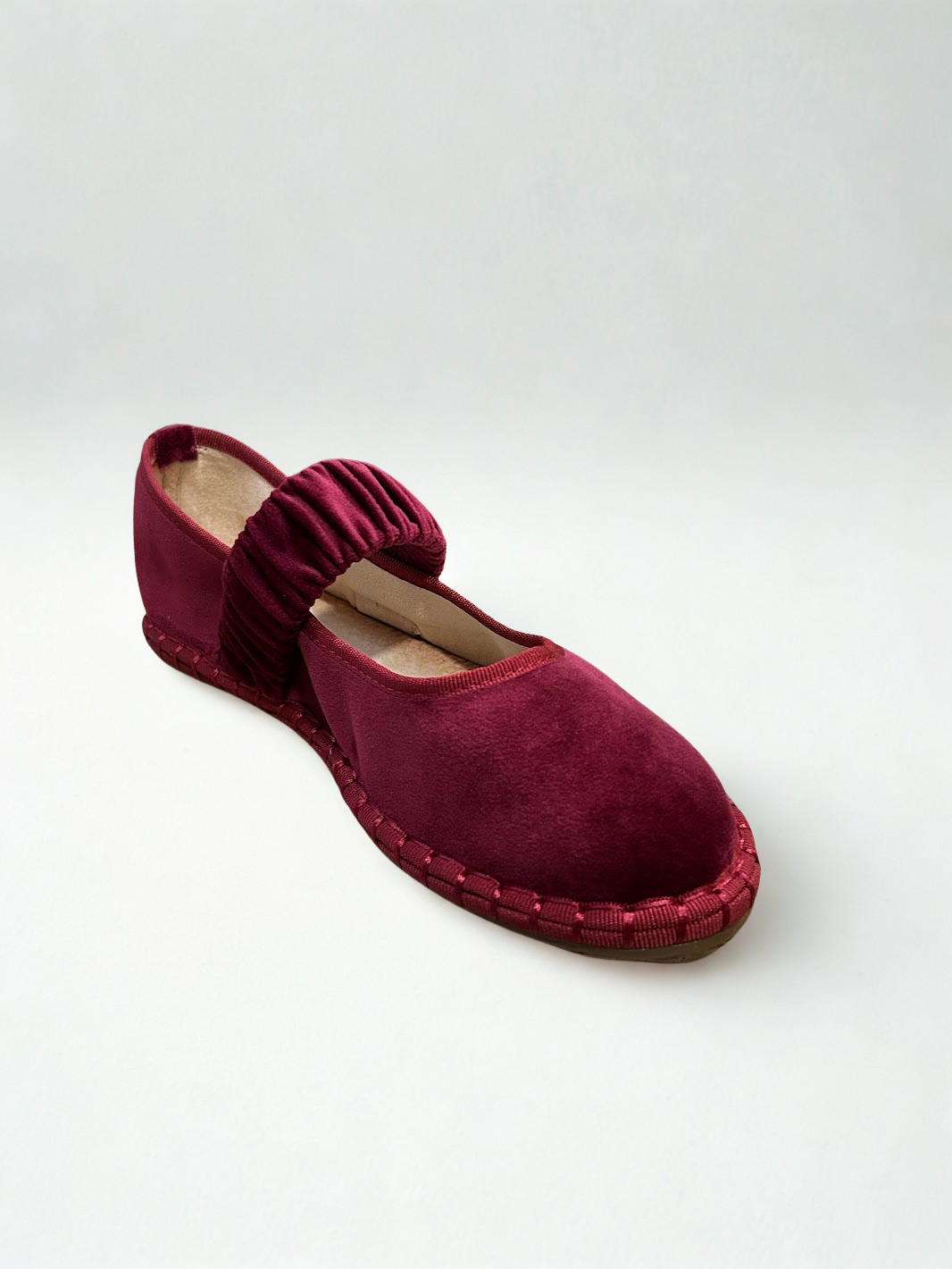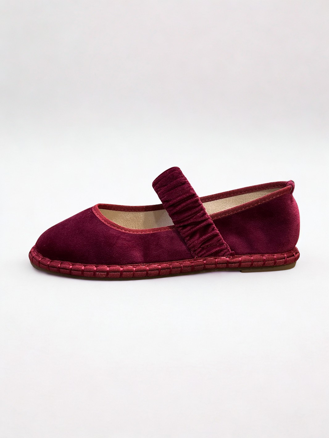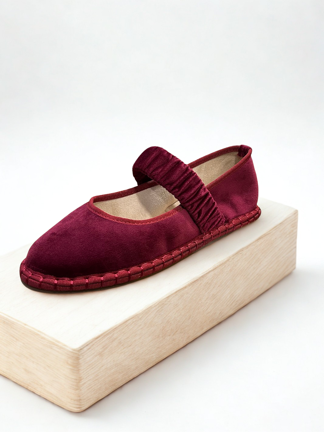 Zapato estilo Merceditas en terciopelo con cinturón elástico ancho en empeine. Suela plana y flexible. Disponible en color black, pink, wine y grey.