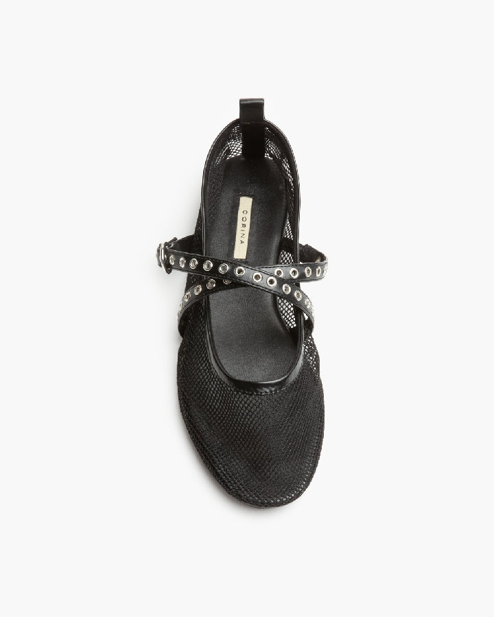 Zapato estilo mercedita plana en acabado de rejilla semitransparente en punta redonda. Detalle de cintas cruzadas con ojales y cierre cinturón.