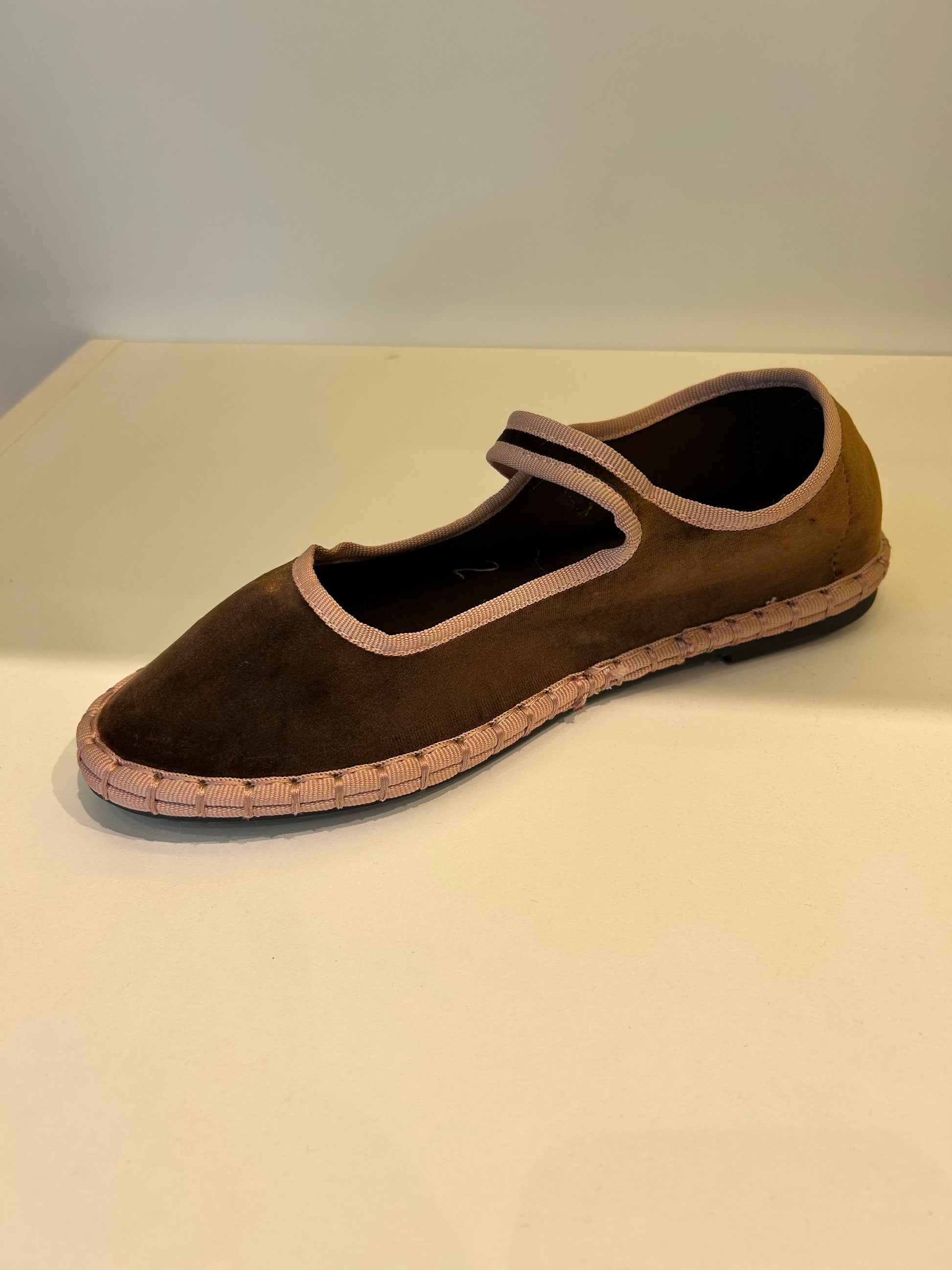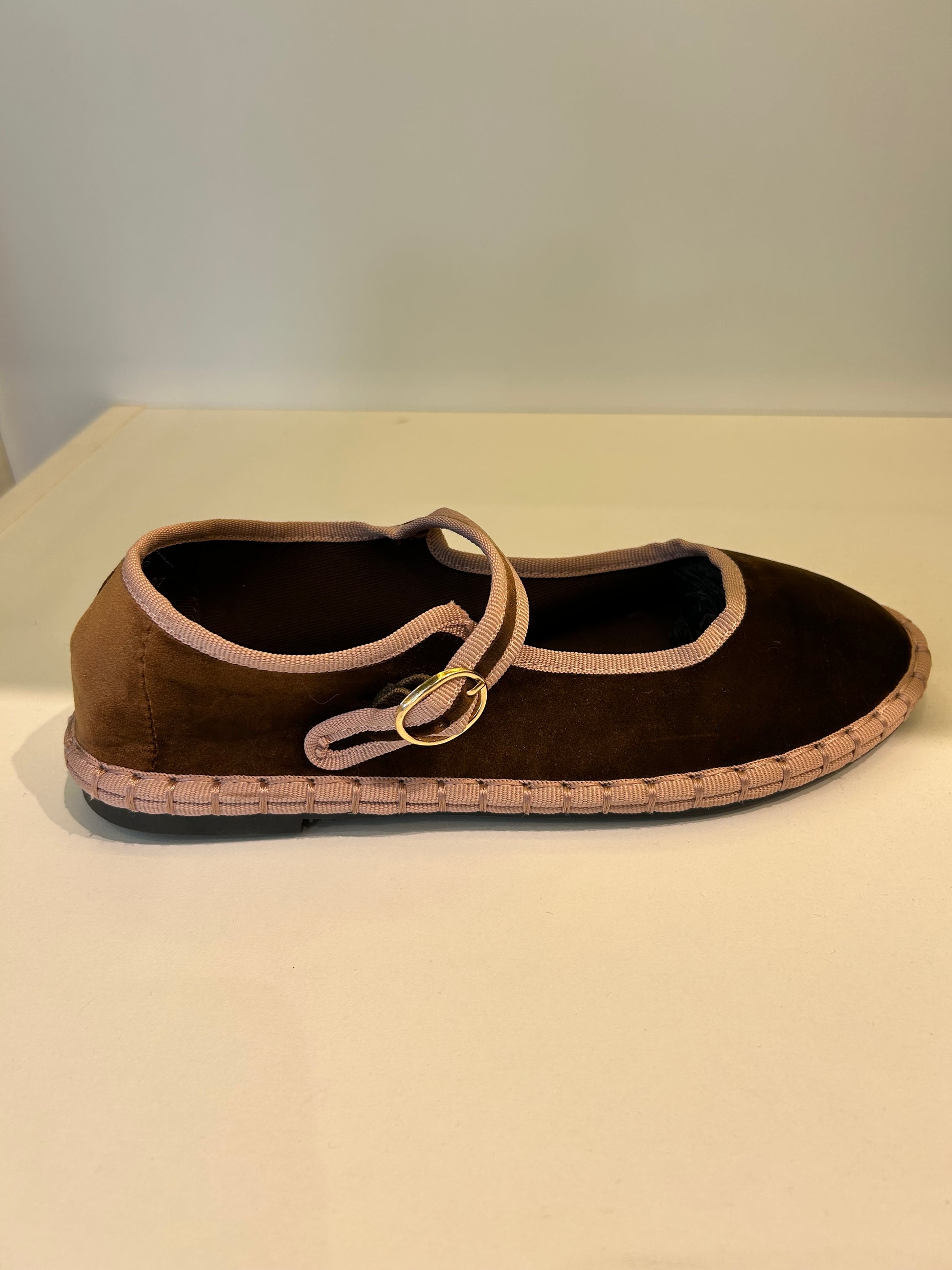 Zapato estilo Merceditas en terciopelo con cinta y cierre cinturón. Suela plana y flexible. Disponible en color pink, Lt brown, purple, violet, magenta y navy.