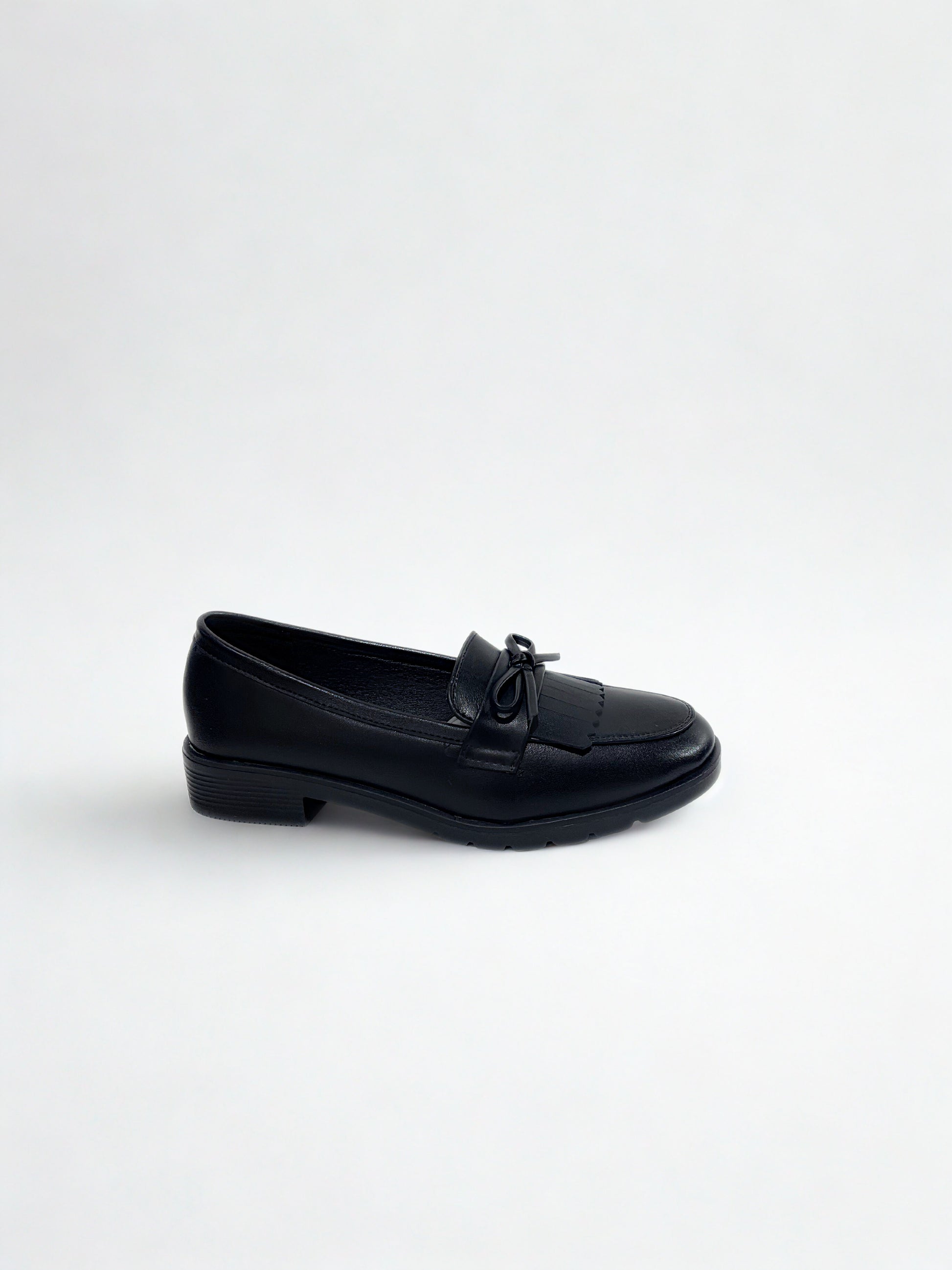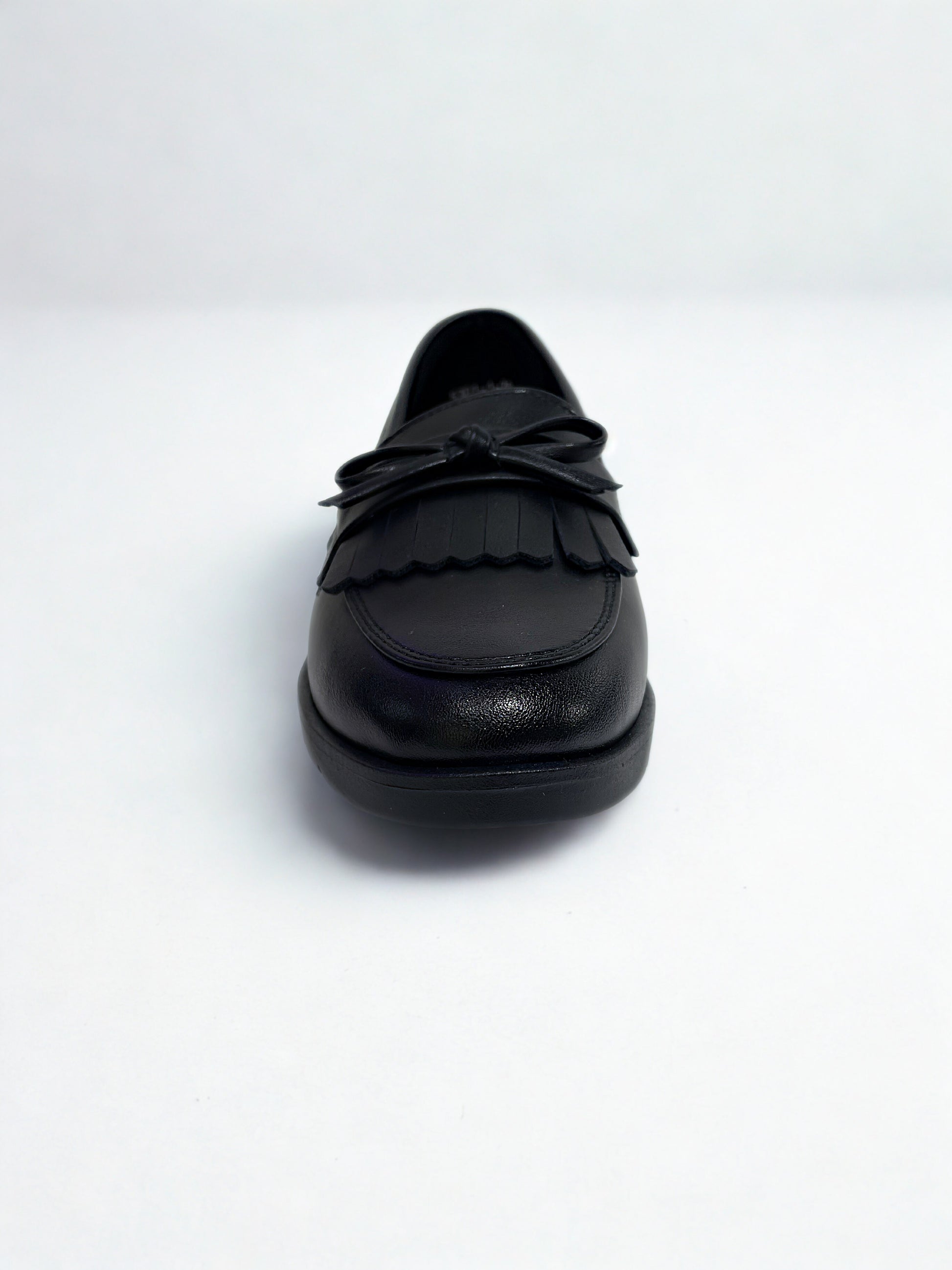 Zapato tipo mocasín con detalle de flecos y lazo en empeine. Acabado efecto brillante y punta redonda. Suela de goma flexible y cómoda. Disponible en color negro y wine.
