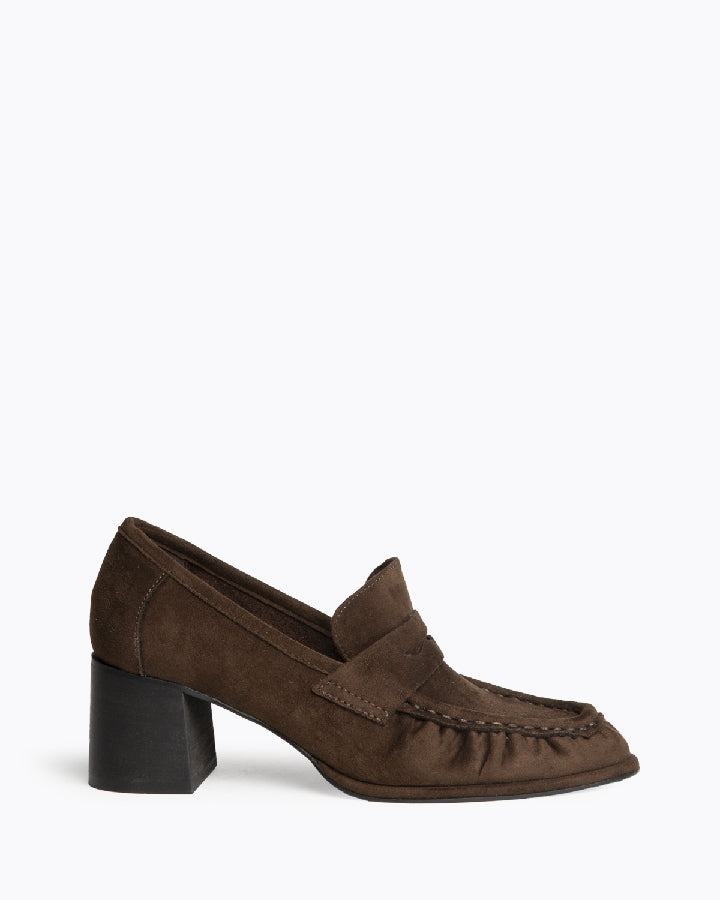 Zapato de tacón estilo mocasín con detalle de antifaz en empeine y copete subido. Fruncido en parte delantera. Acabado en punta redonda. Disponible en color negro y café.