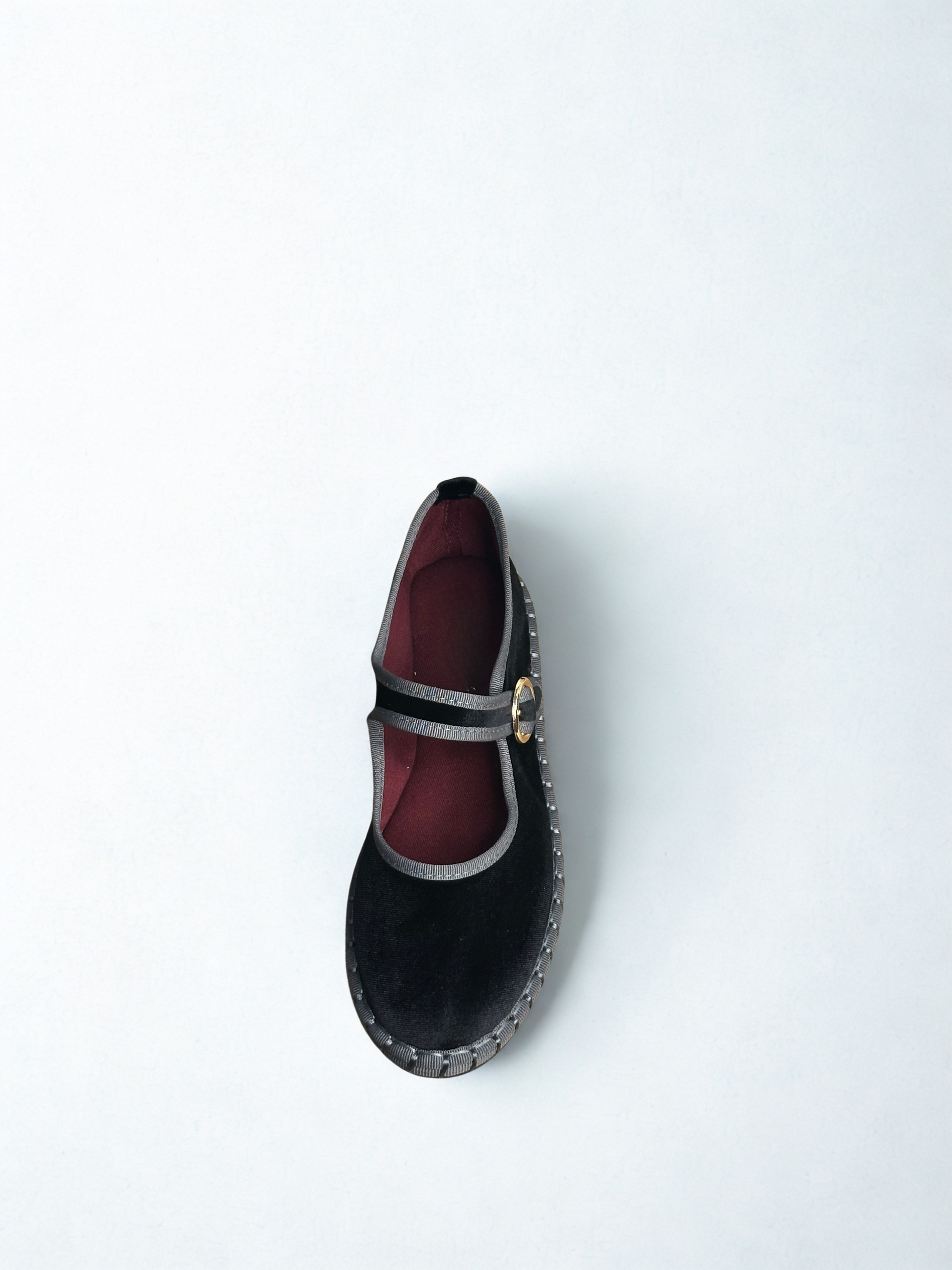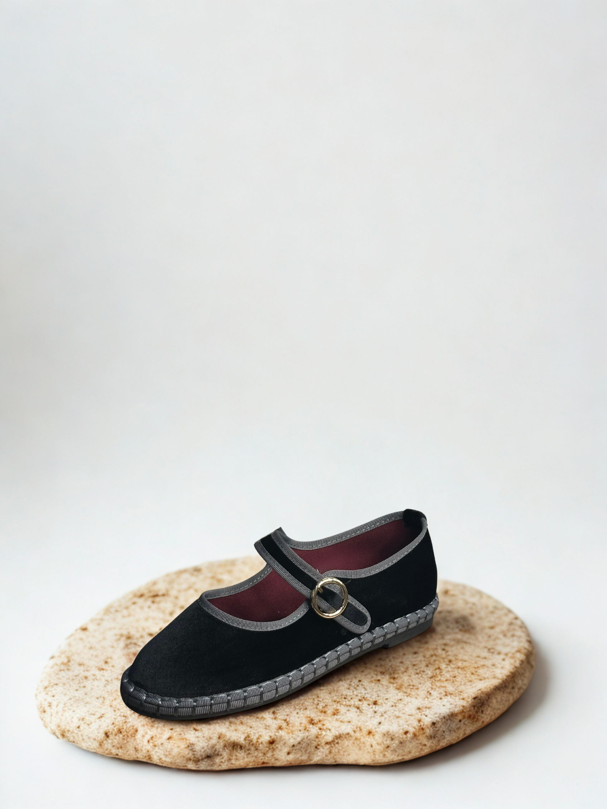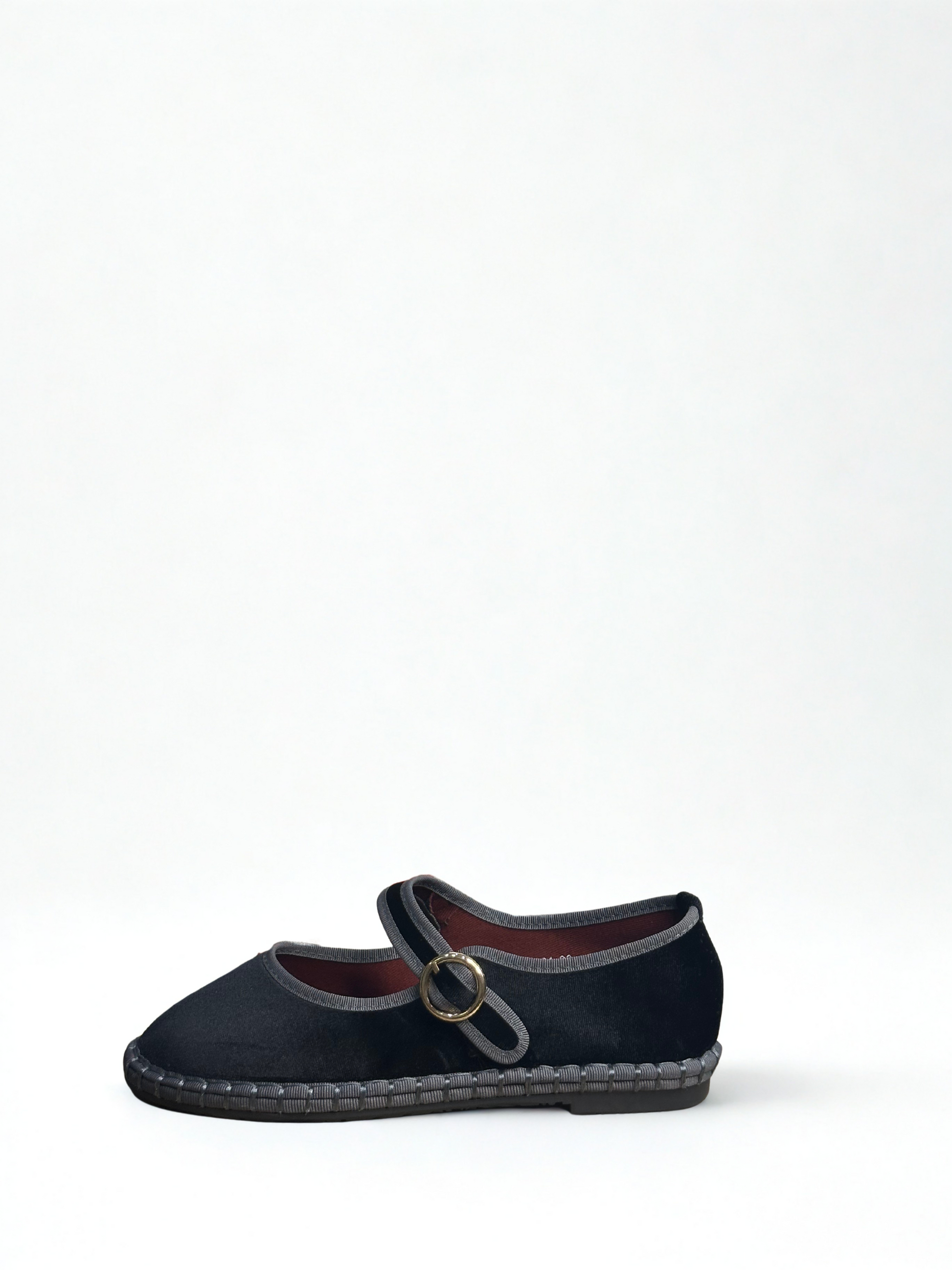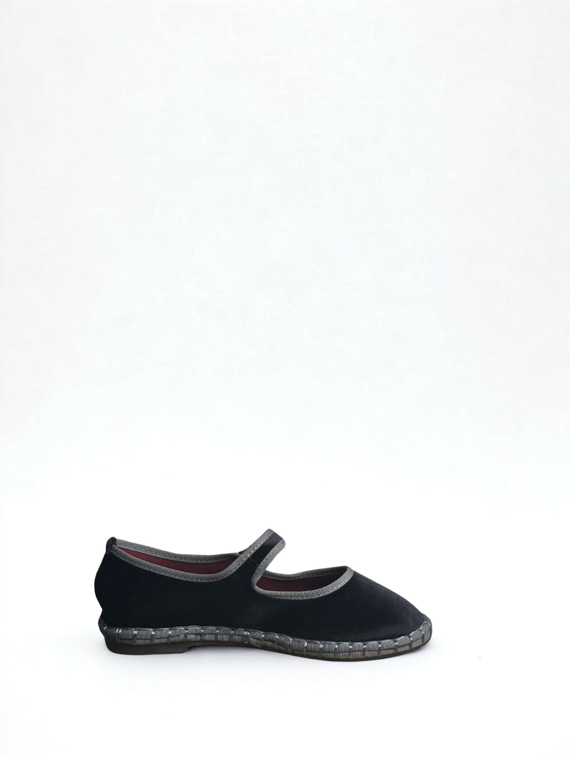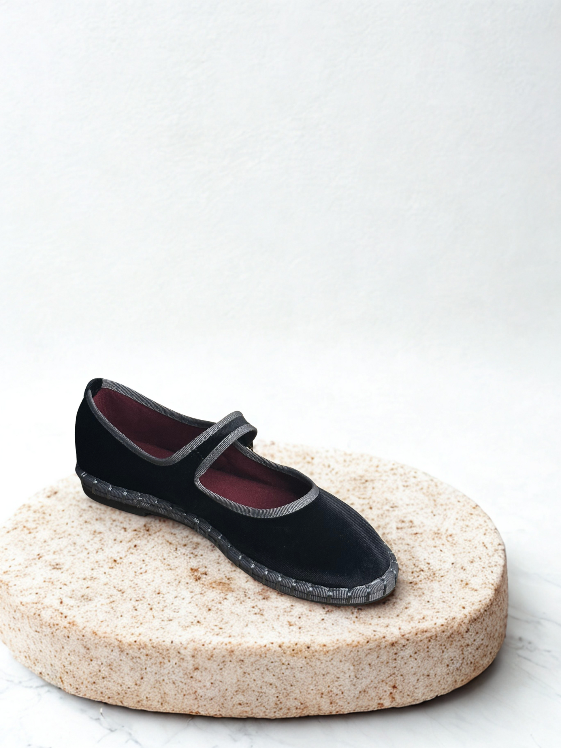 Zapato estilo Merceditas en terciopelo con cinta y cierre cinturón. Suela plana y flexible. Disponible en color brown/wine, wine/wine, green, black/grey, sapphire blue, purple/pink.
