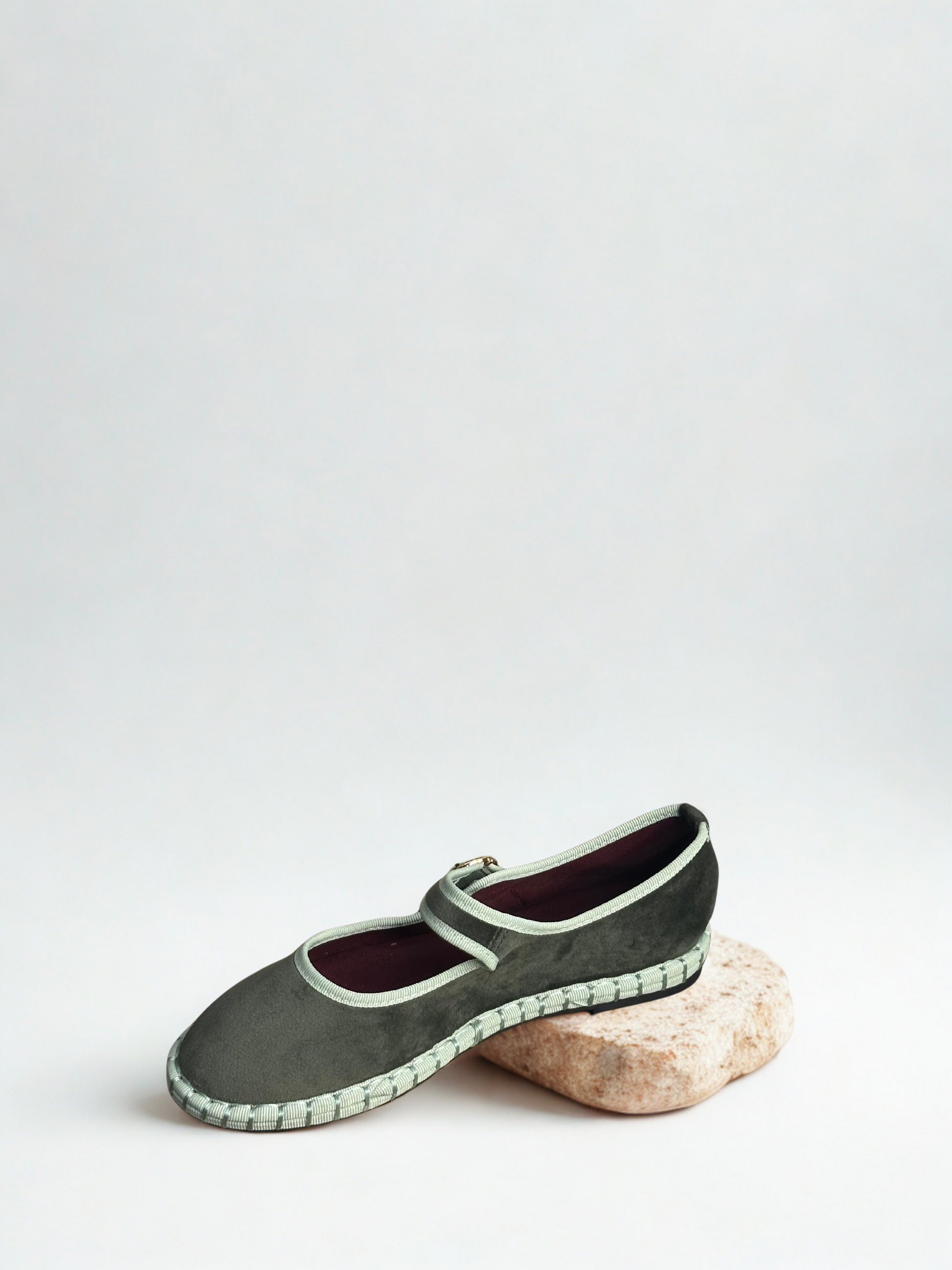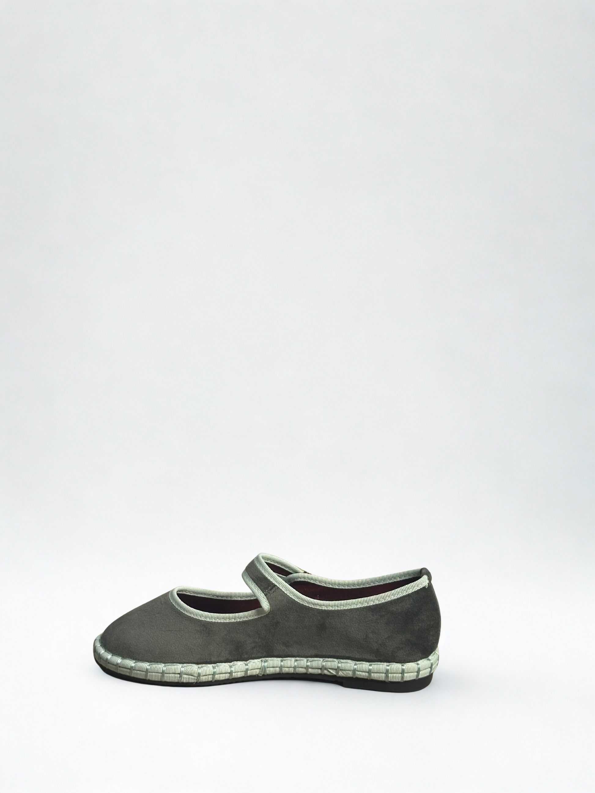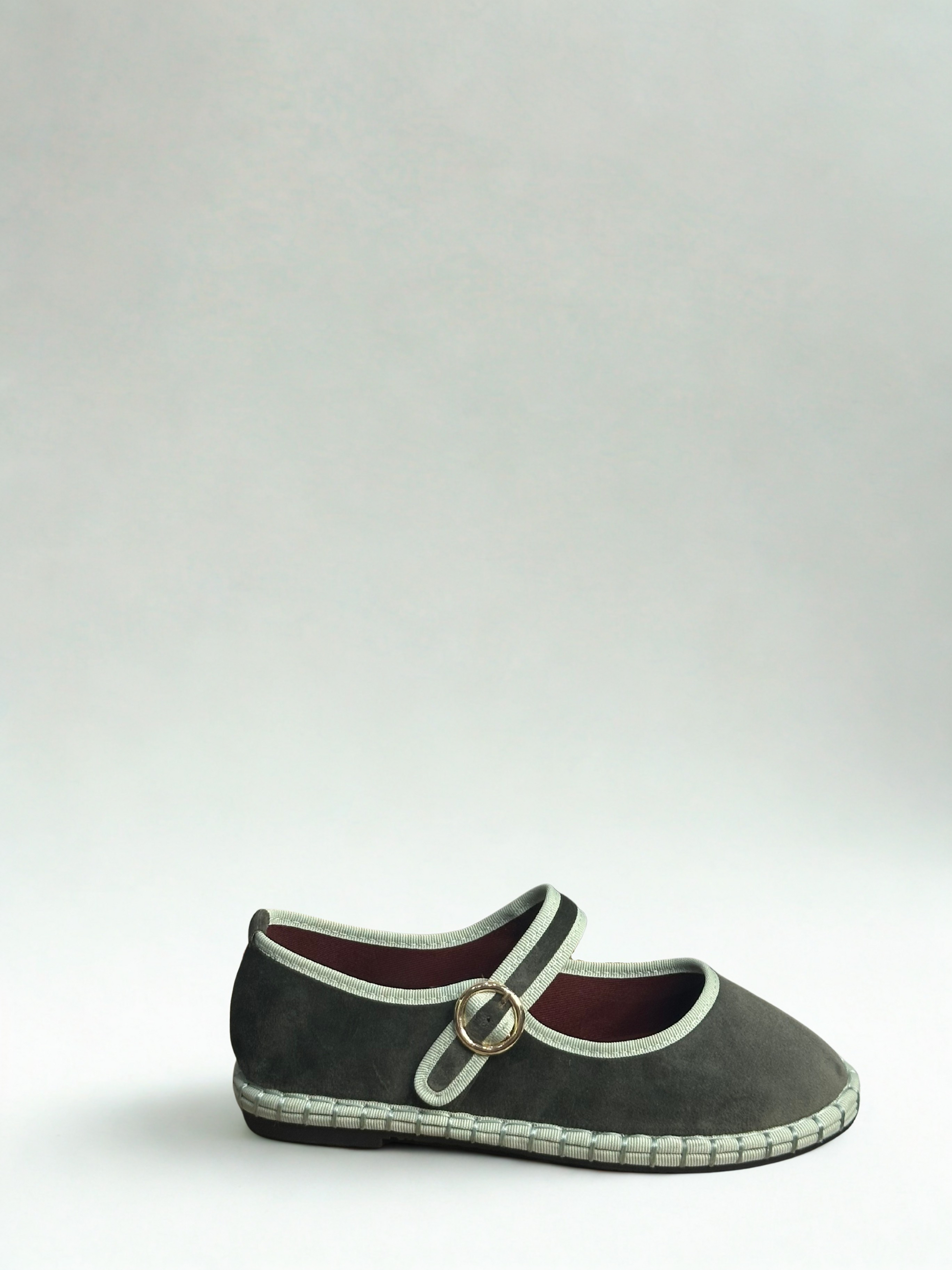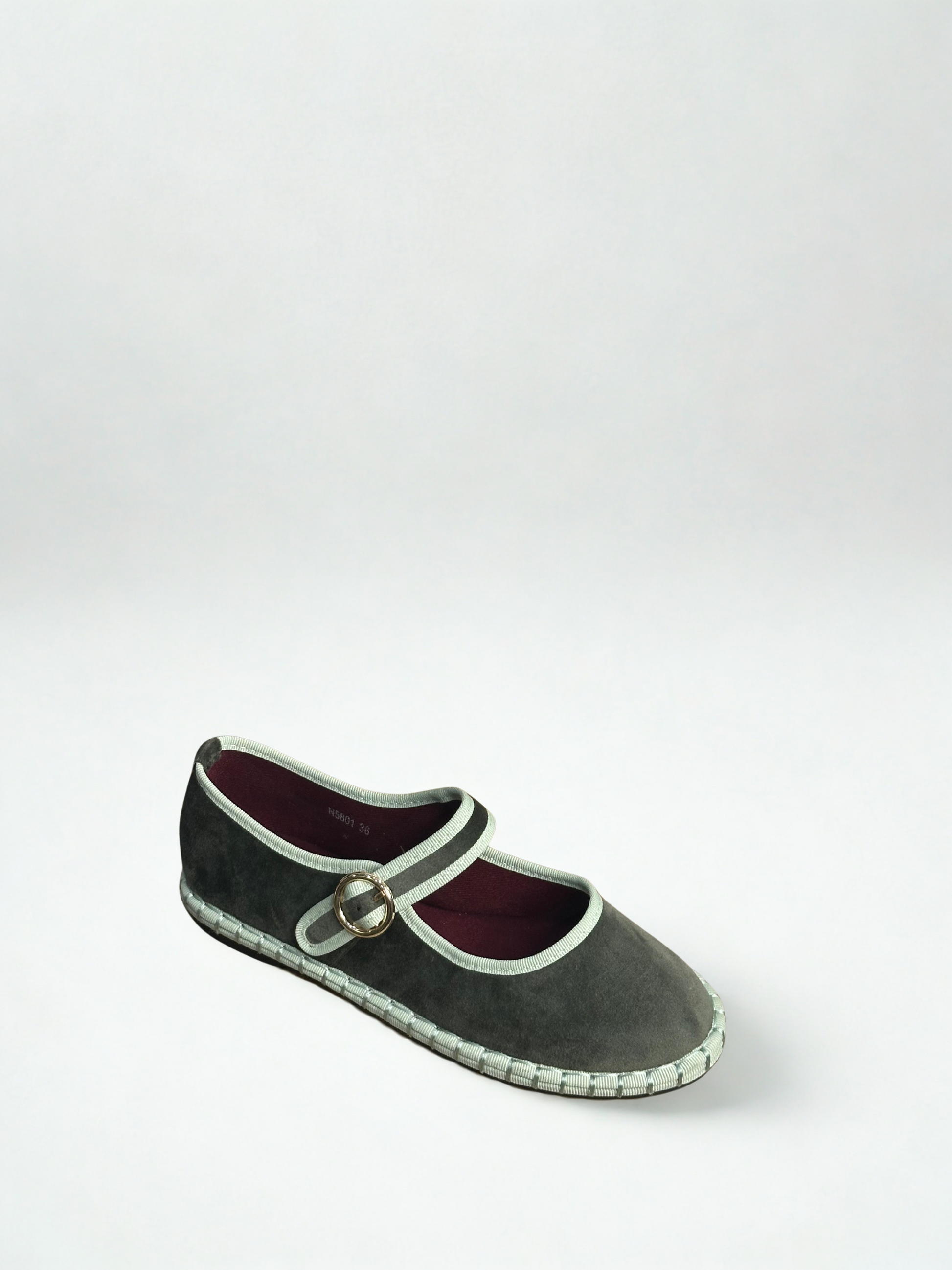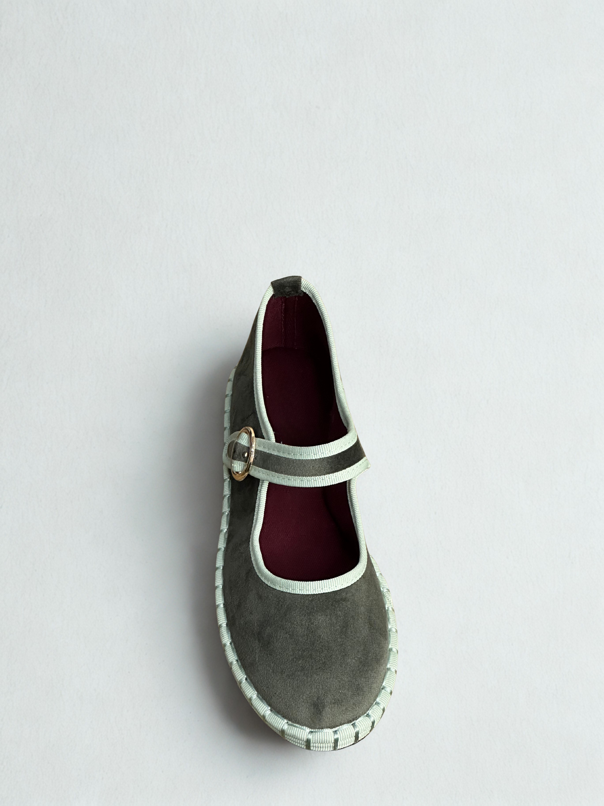 Zapato estilo Merceditas en terciopelo con cinta y cierre cinturón. Suela plana y flexible. Disponible en color brown/wine, wine/wine, green, black/grey, sapphire blue, purple/pink.