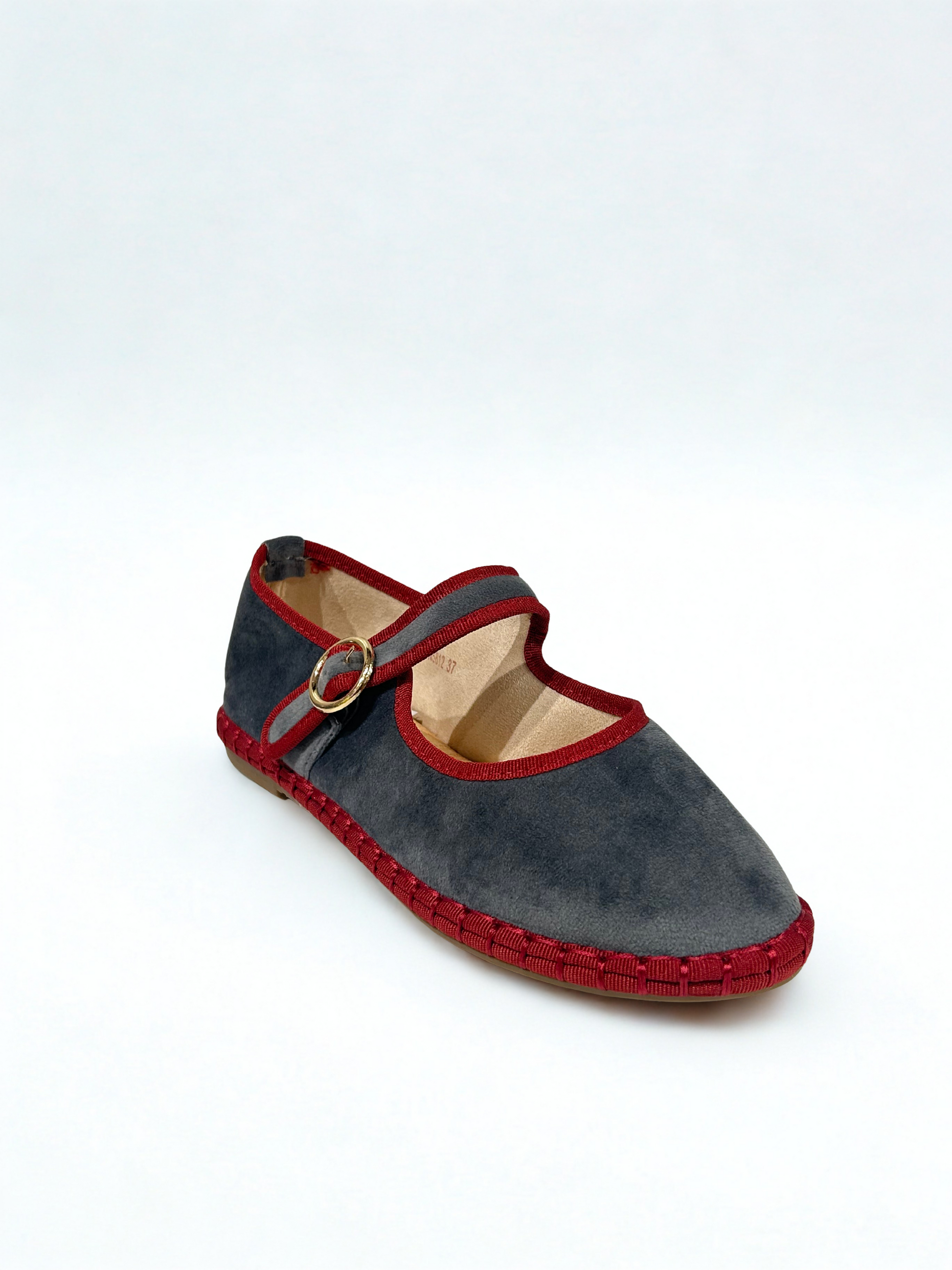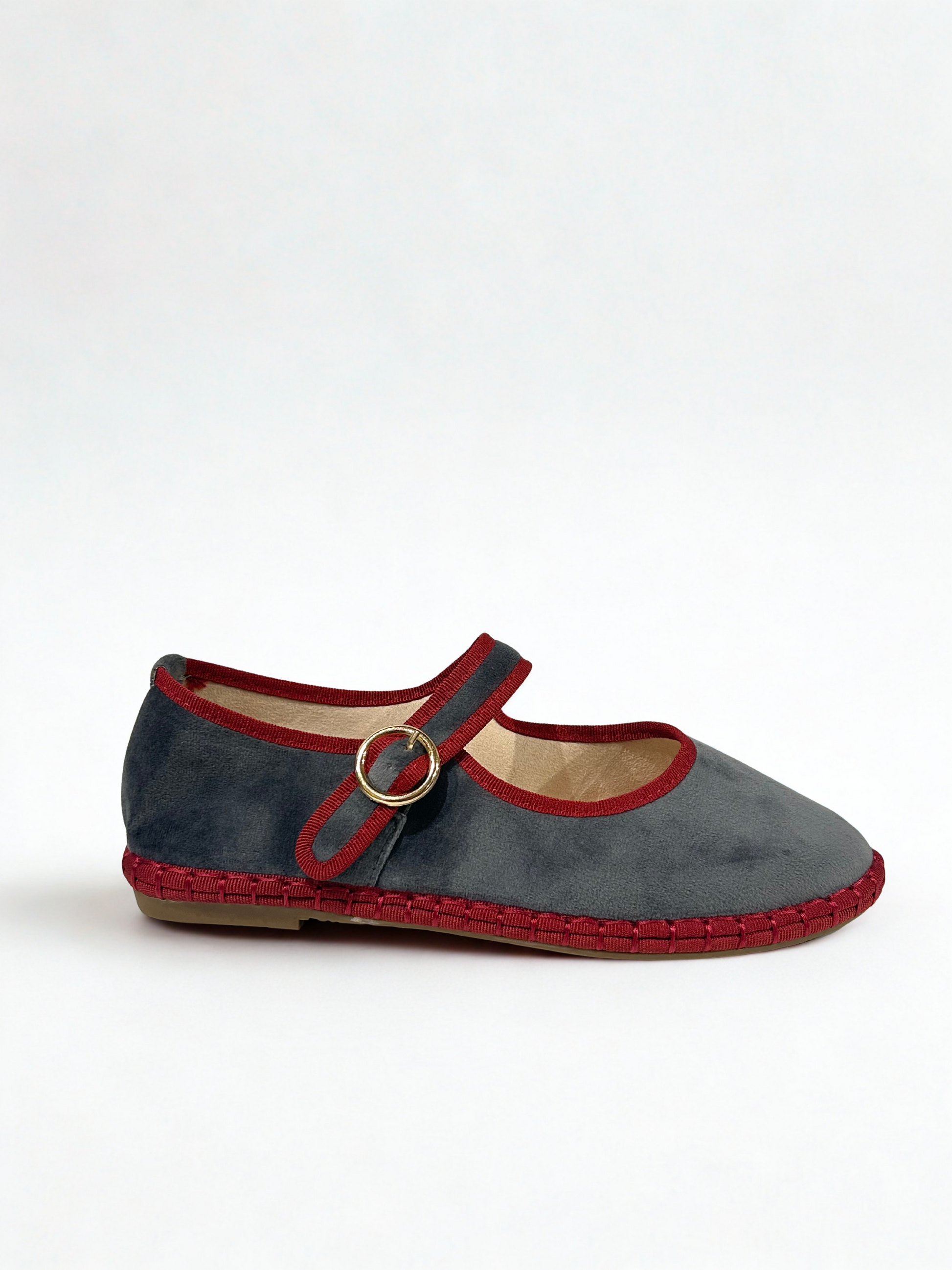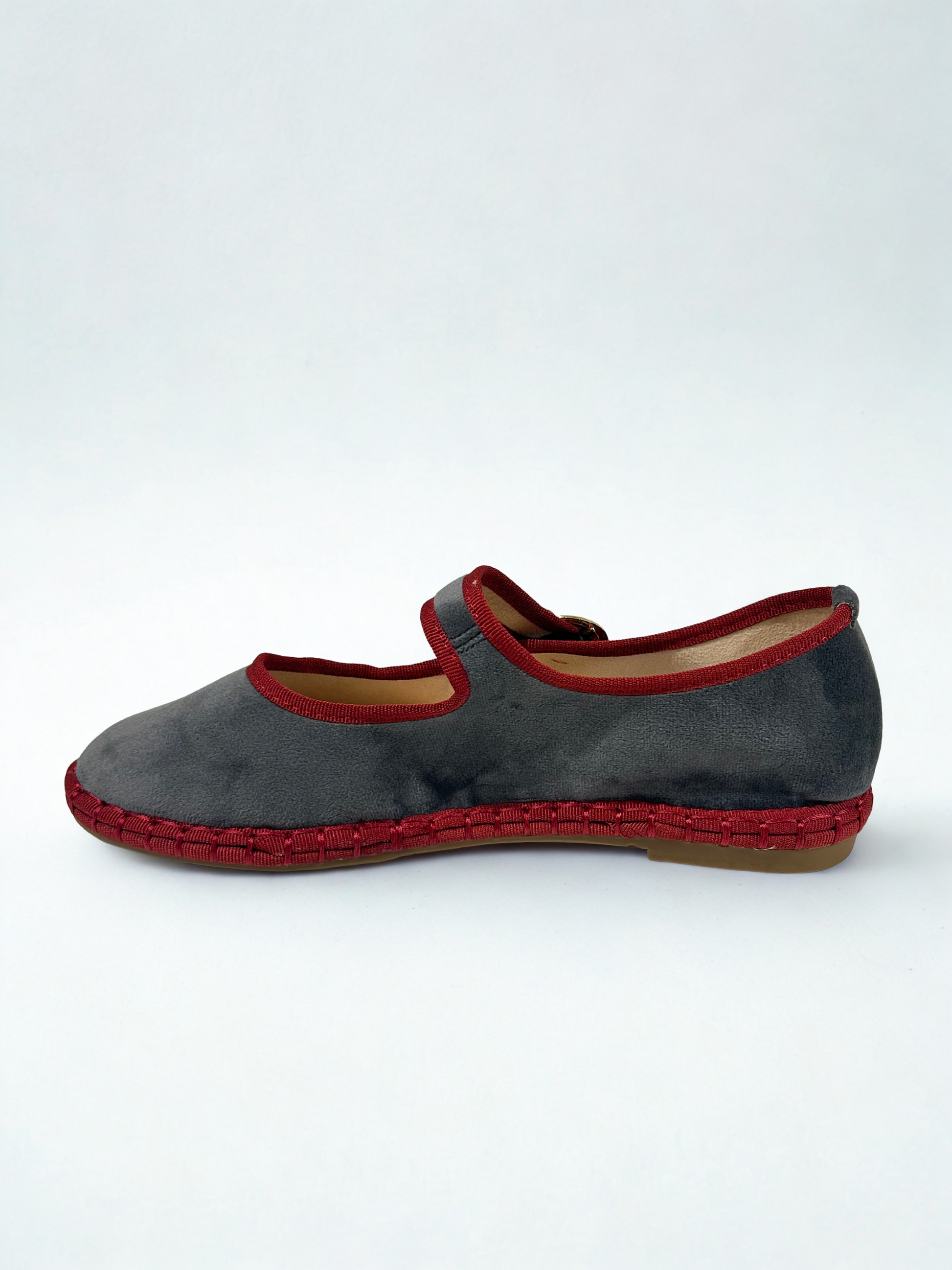 Zapato estilo Merceditas en terciopelo con cinta y cierre cinturón. Suela plana y flexible. Disponible en color grey/wine, brown/wine, wine/wine, green, black/grey, sapphire blue, purple/pink.