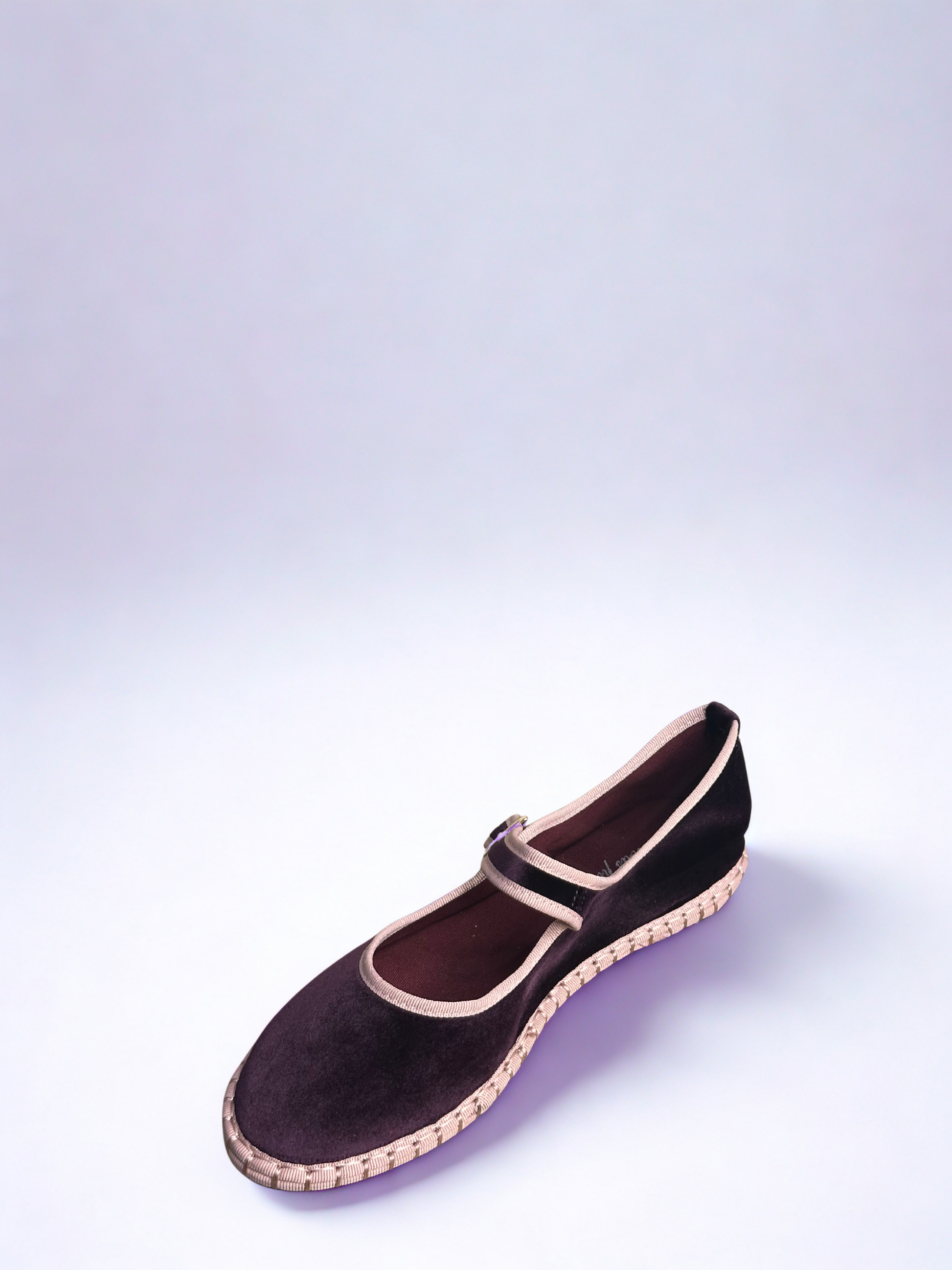 Zapato estilo Merceditas en terciopelo con cinta y cierre cinturón. Suela plana y flexible. Disponible en color brown/wine, wine/wine, green, black/grey, sapphire blue, purple/pink.