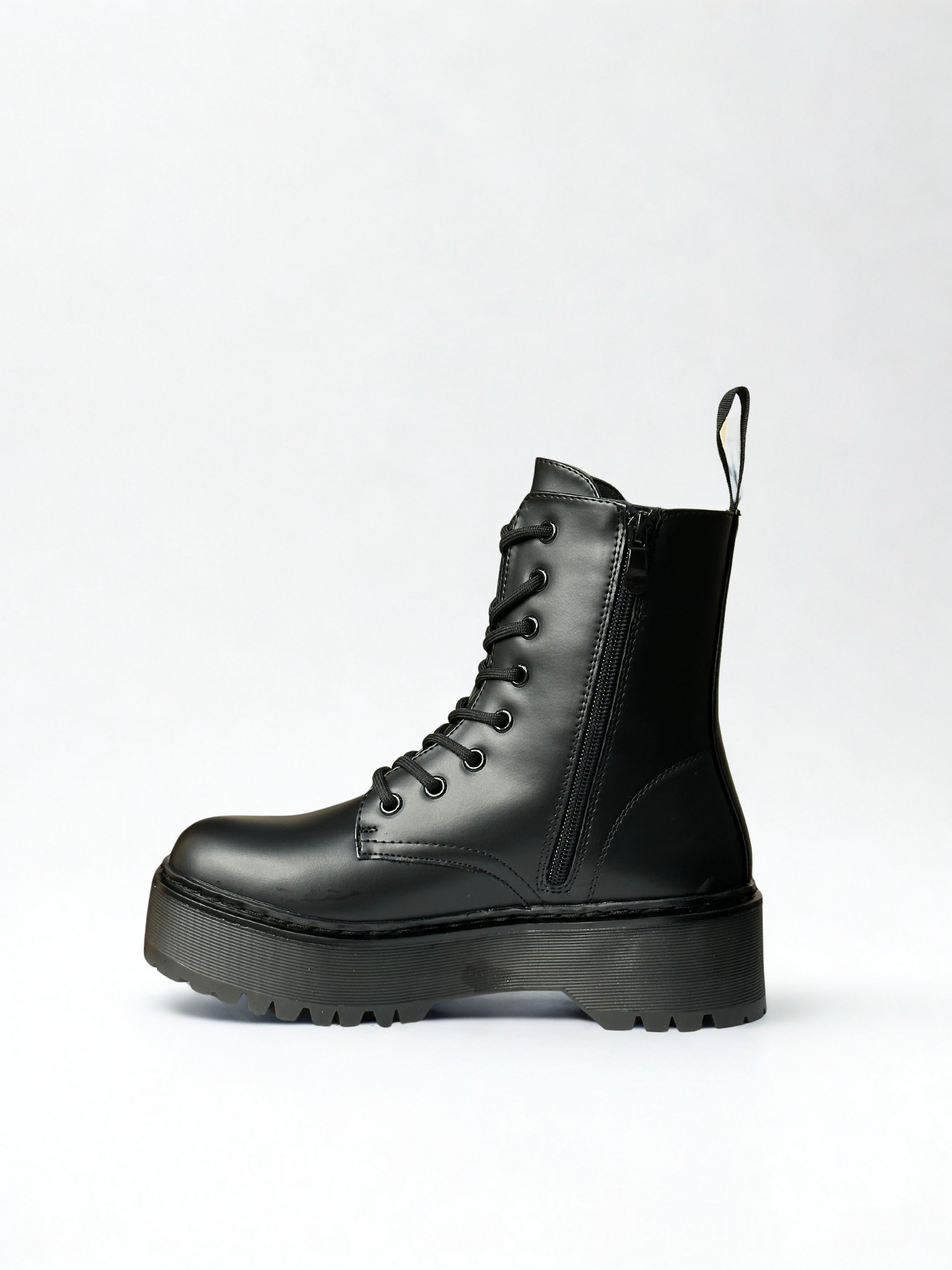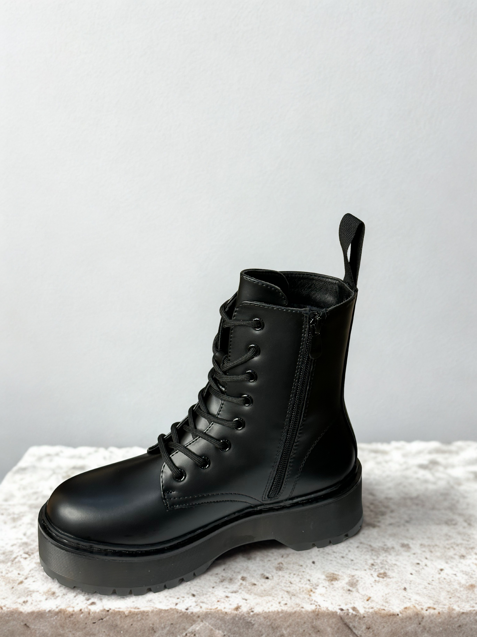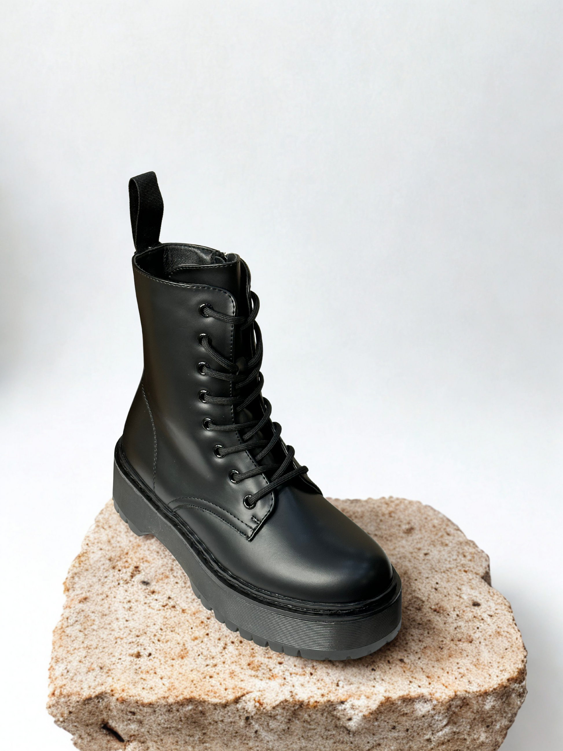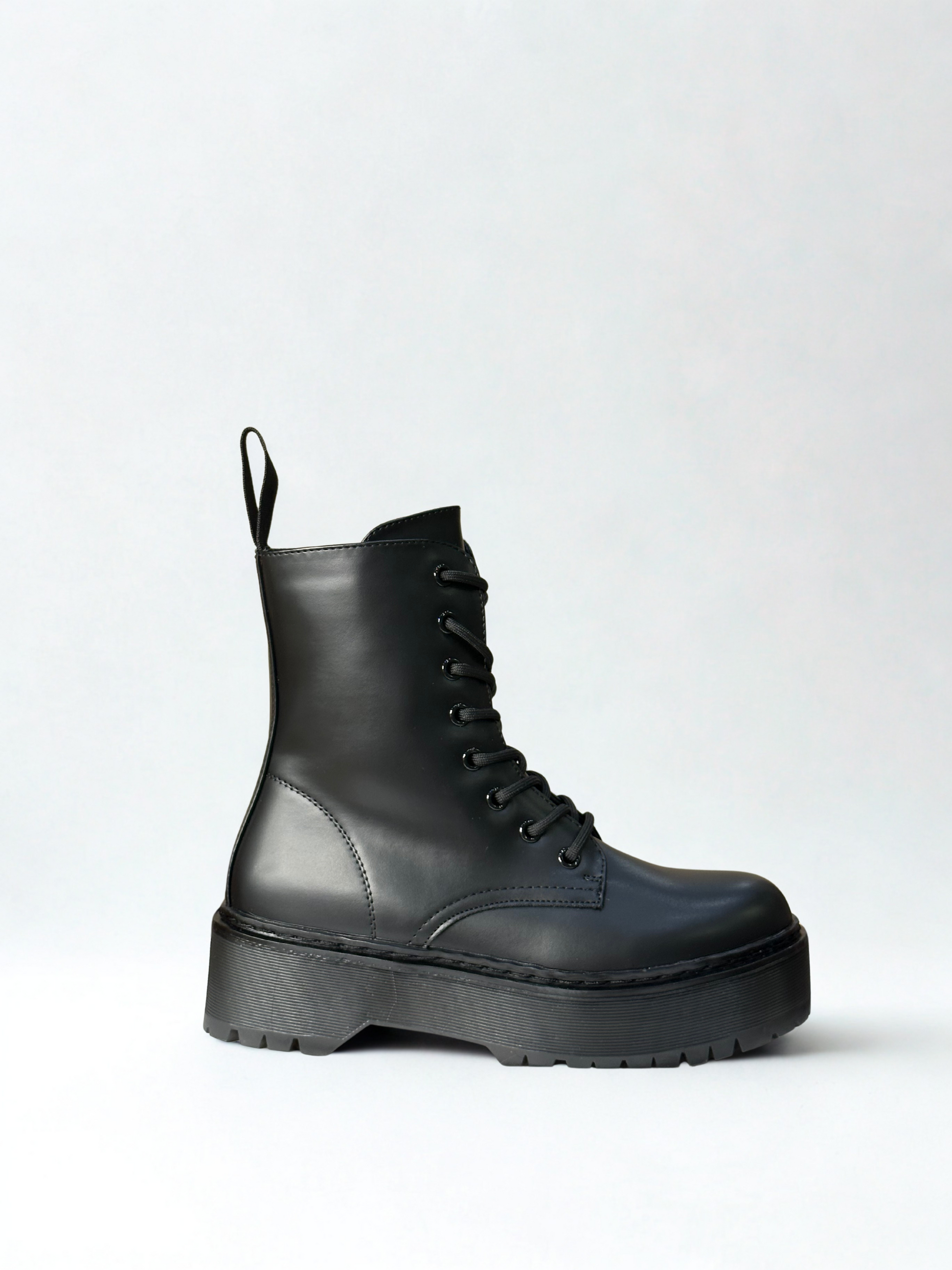 Botín estilo militar acordonado. Detalle de tirador en la parte trasera. Acabado en punta redonda. Suela volumen. Disponible en color negro.