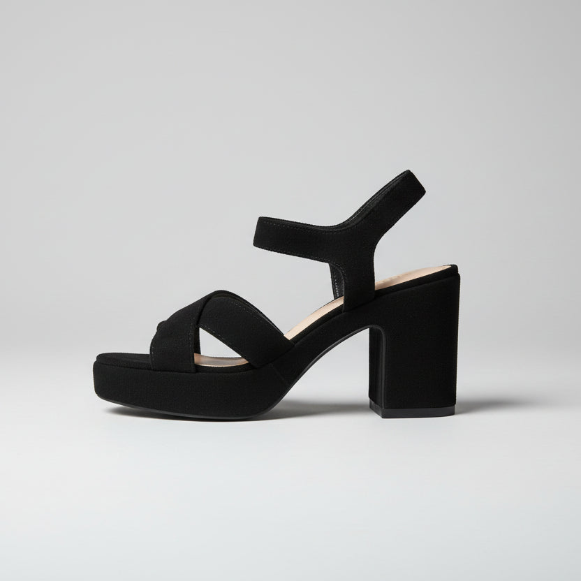 Sandalia de plataforma en terciopelo negro con cierre de cinturón.