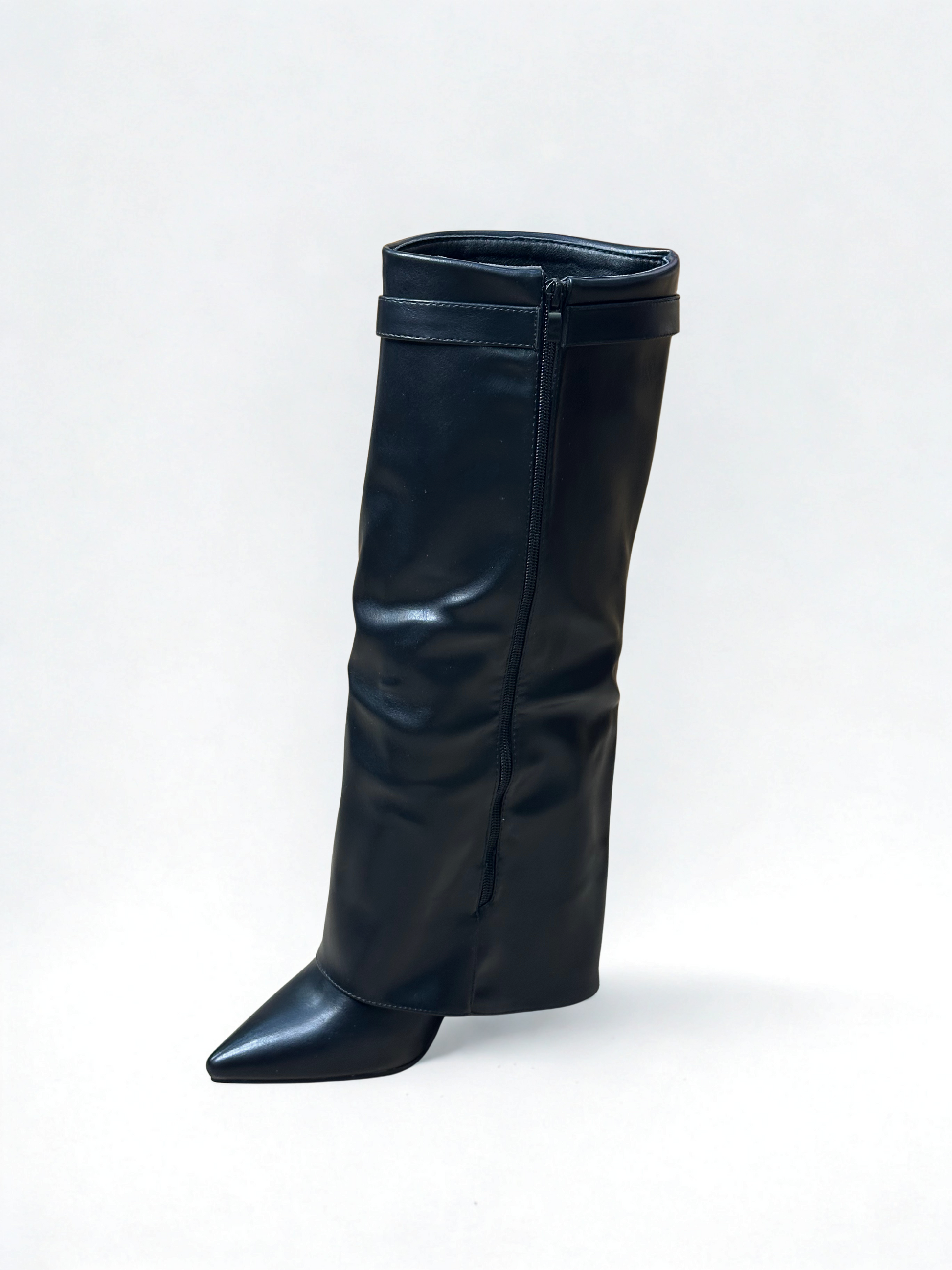Bota de caña alta con solapa, detalle de hebilla en el lateral. Tacón cuadrado y cierre con cremallera. Disponible en color negro, chocolate y wine.