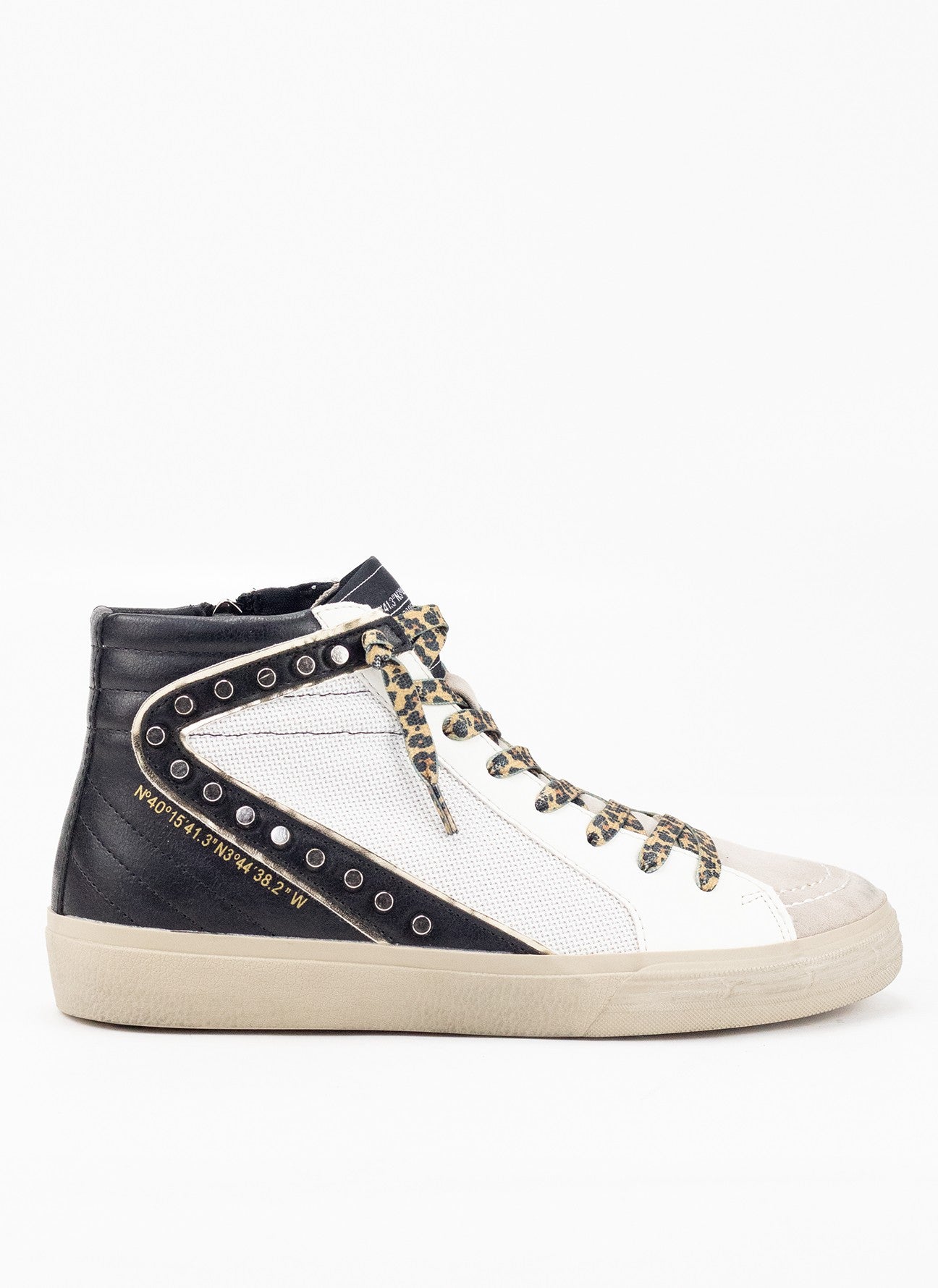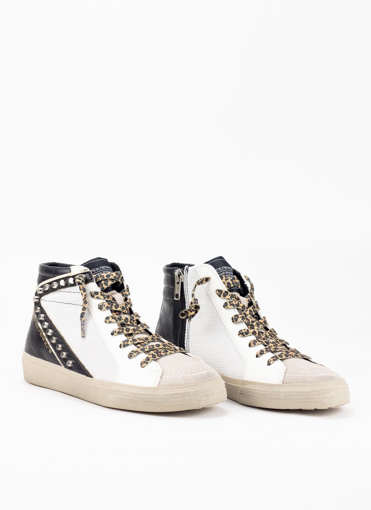 Botín tipo sneakers estilo retro, diseñada con tachuelas en parte lateral. Cierre con cordones estampado de leopardo de ocho pasadas y cremallera en lateral interno. Plantilla cómoda e intercambiable. Disponible en colores leopardo y multicolor.