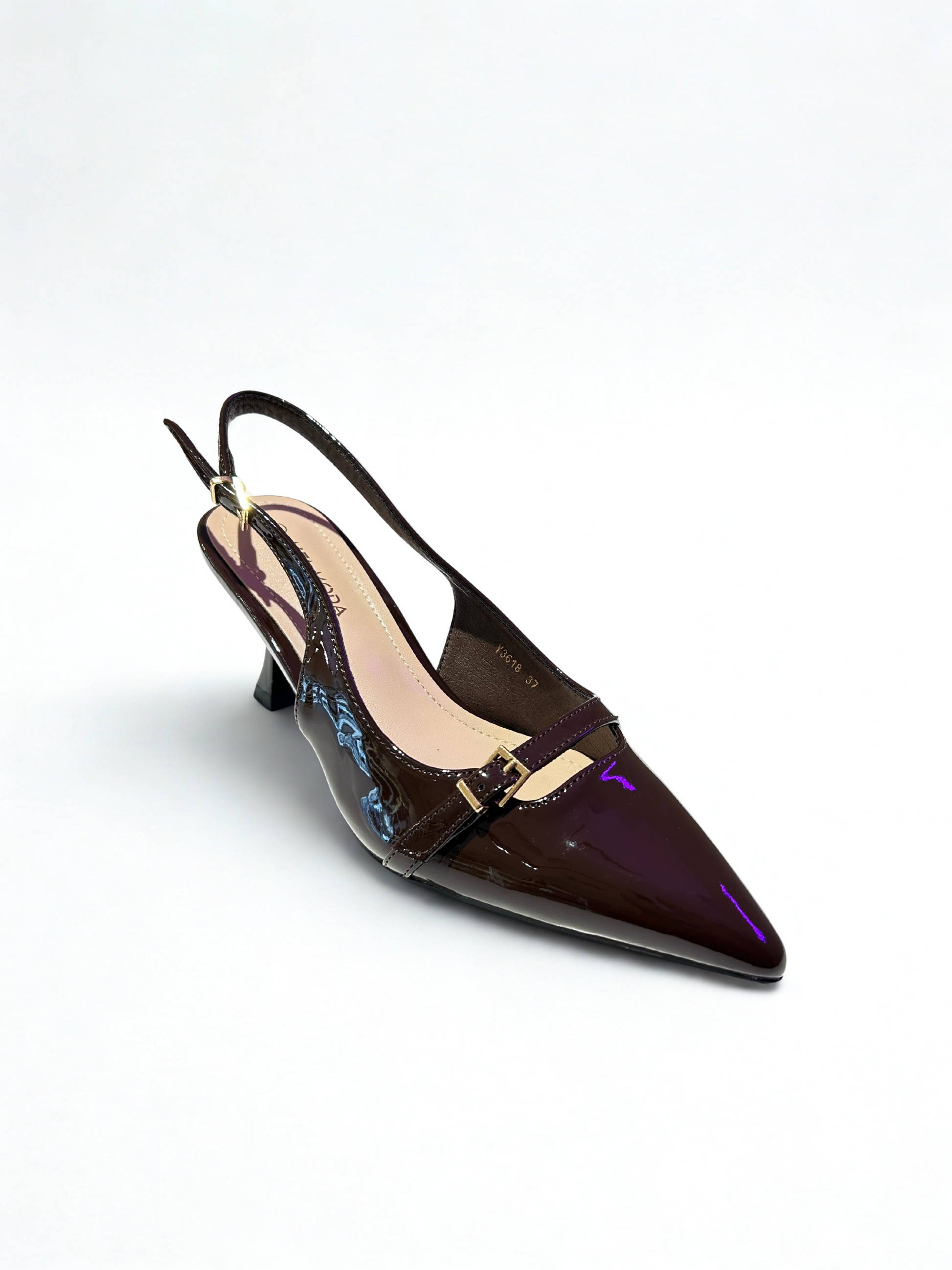 Zapato de tacón destalonados con cinturón en tobillo y cierre hebilla , acabado en punta. Disponible en color negro y marron.